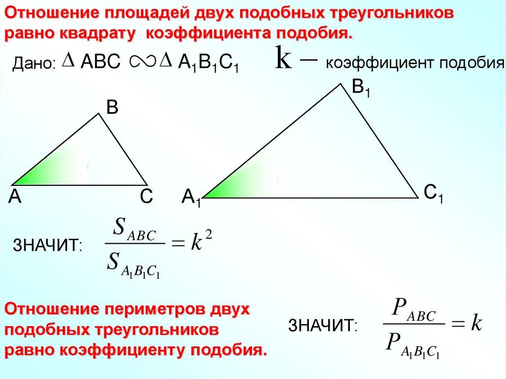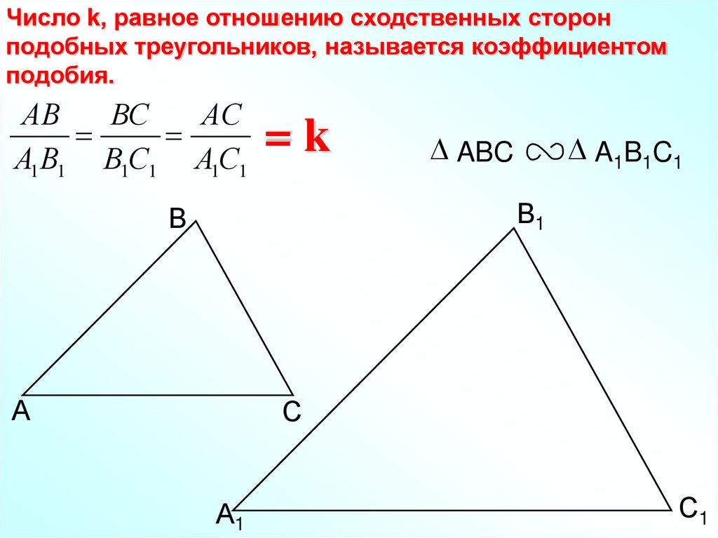 Число k, равное отношению сходственных сторонподобных треугольников, называется коэффициентом