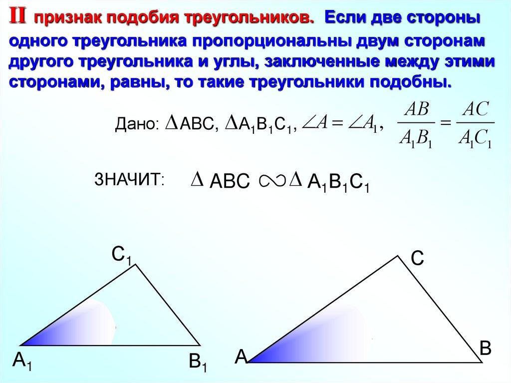 II признак подобия треугольников. Если две стороныодного треугольника пропорциональны двум сторонам