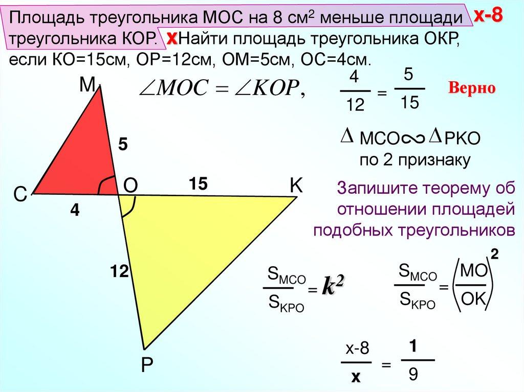 Площадь треугольника МОС на 8 см2 меньше площади x-8треугольника КОР. xНайти площадь треугольника ОКР,