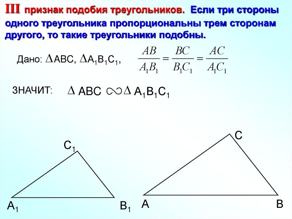 III признак подобия треугольников. Если три стороныодного треугольника пропорциональны трем сторонам