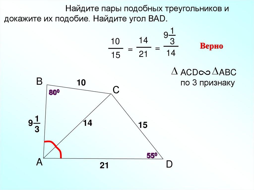 Найдите пары подобных треугольников идокажите их подобие. Найдите угол ВАD.