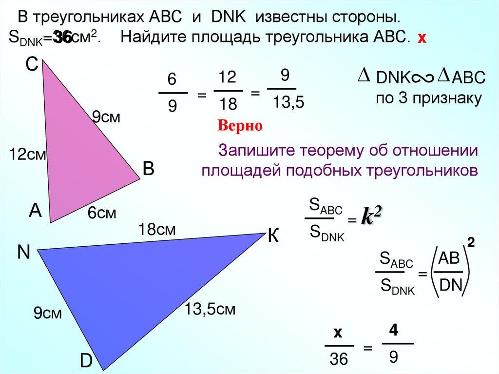 В треугольниках АВС и DNK известны стороны.SDNK=36cм