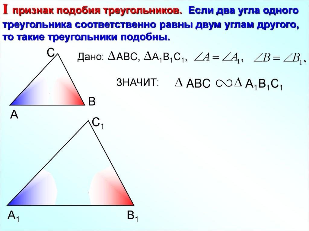 I признак подобия треугольников. Если два угла одноготреугольника соответственно равны двум углам другого,