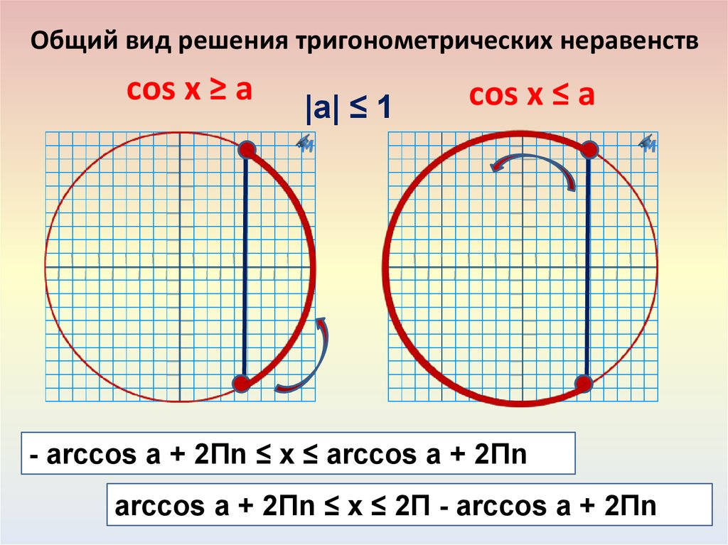 - arccos a + 2Пn ≤ x ≤ arccos a + 2Пn