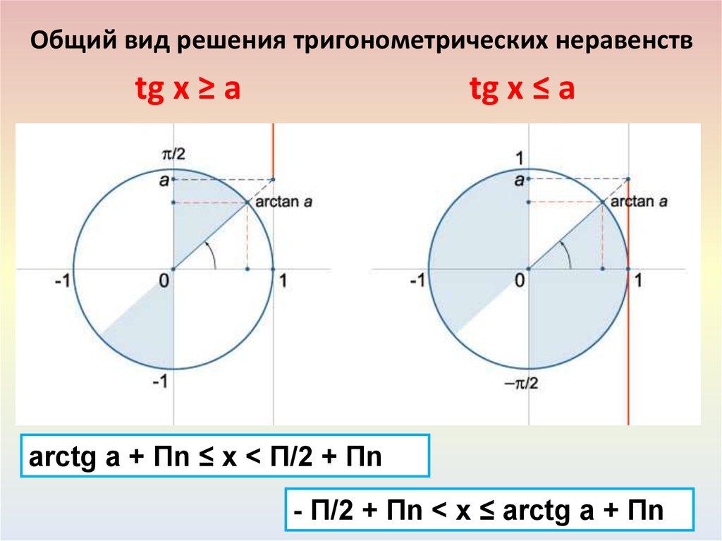 Общий вид решения тригонометрических неравенствtg x ≥ a