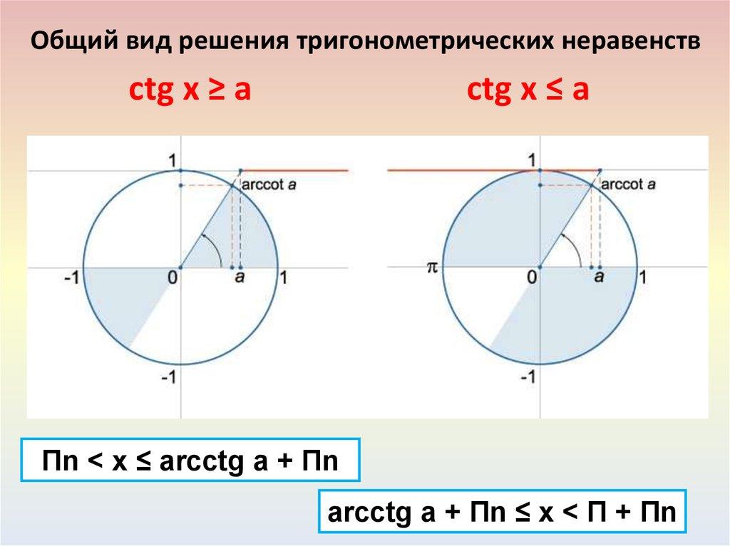Общий вид решения тригонометрических неравенствctg x ≥ a