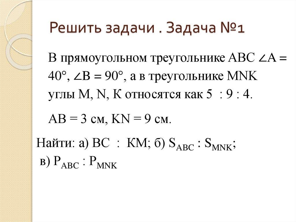 Решение задачи №1а) Так как АВ : NK = 3 : 9 = 1 : 3, то ВС : КМ = 1 : 3.