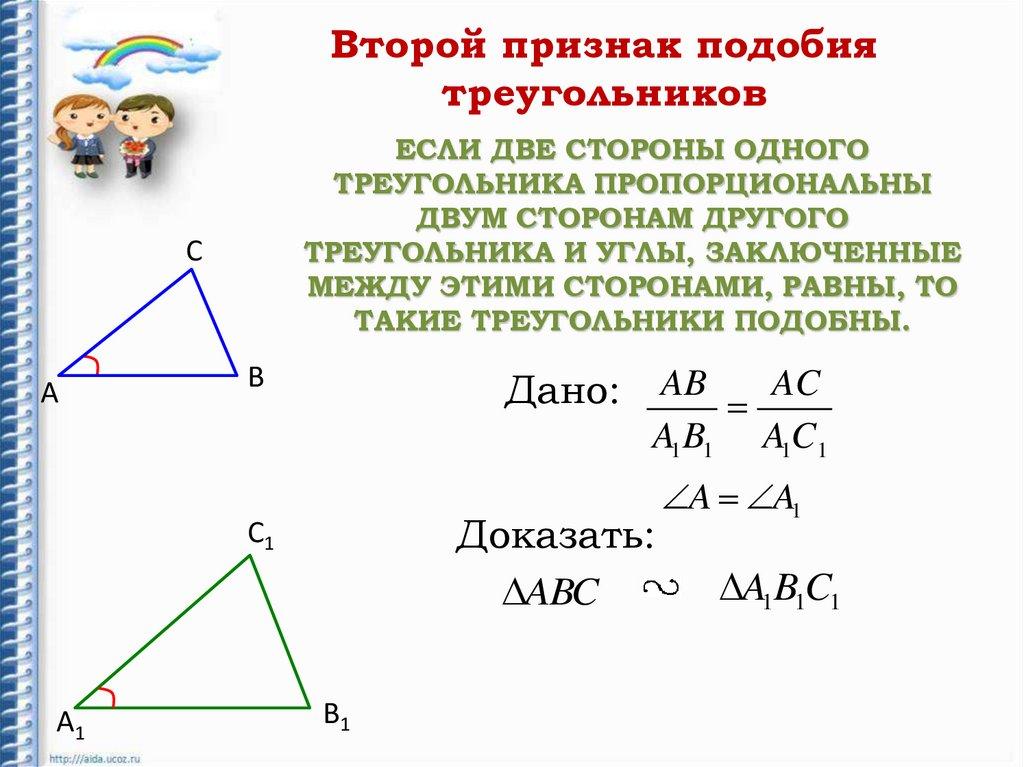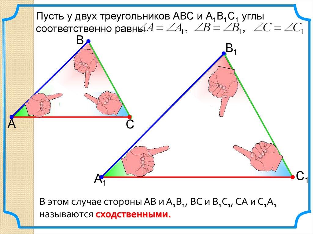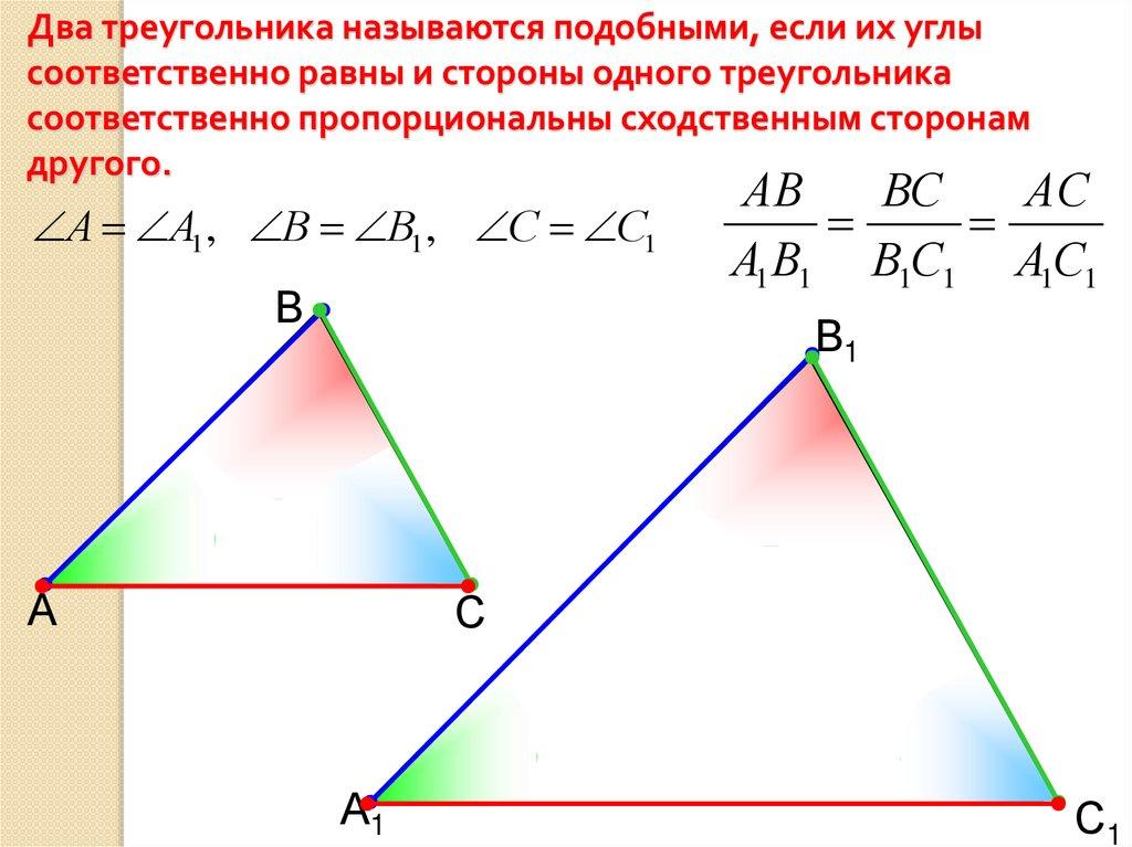 Два треугольника называются подобными, если их углысоответственно равны и стороны одного треугольника