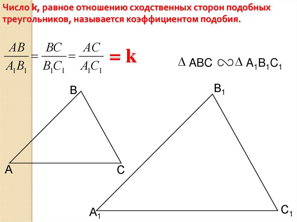Число k, равное отношению сходственных сторон подобныхтреугольников, называется коэффициентом подобия.