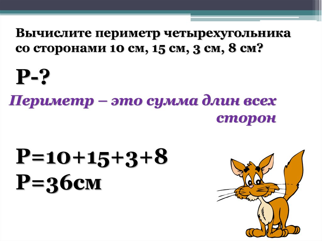 Вычислите периметр четырехугольникасо сторонами 10 см, 15 см, 3 см, 8 см?
