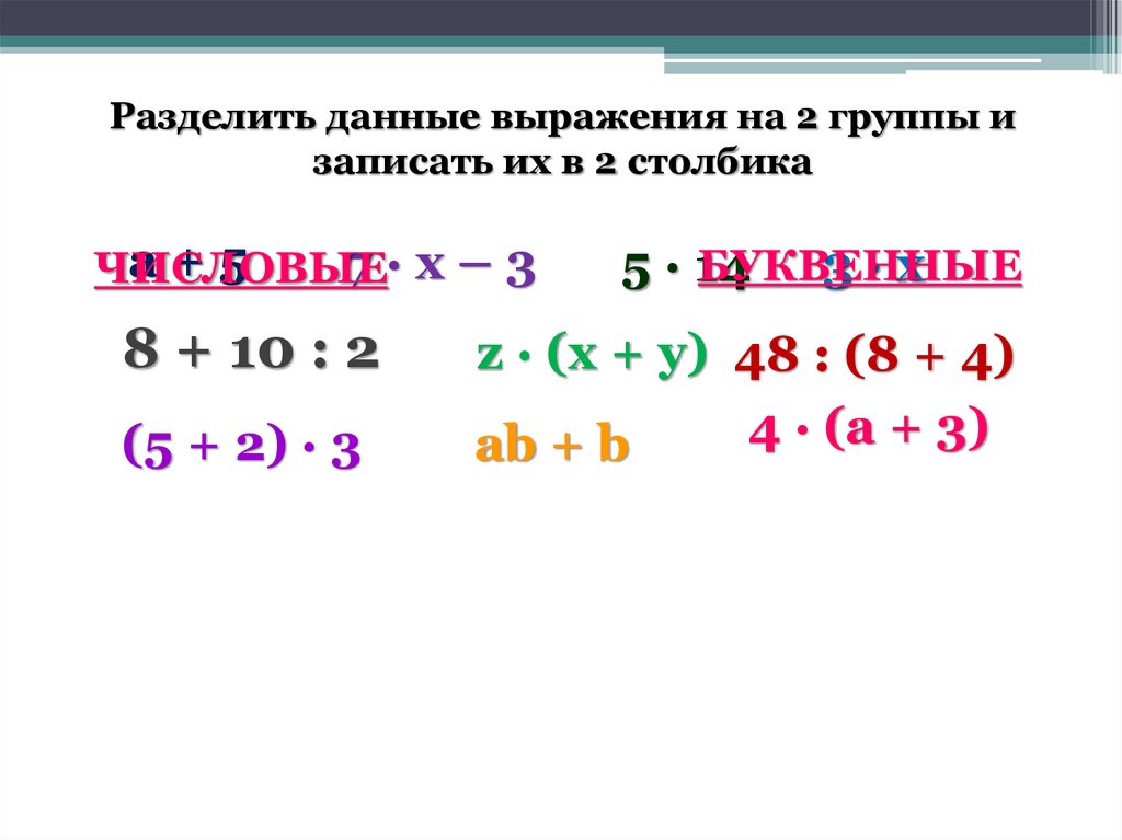 Разделить данные выражения на 2 группы изаписать их в 2 столбика