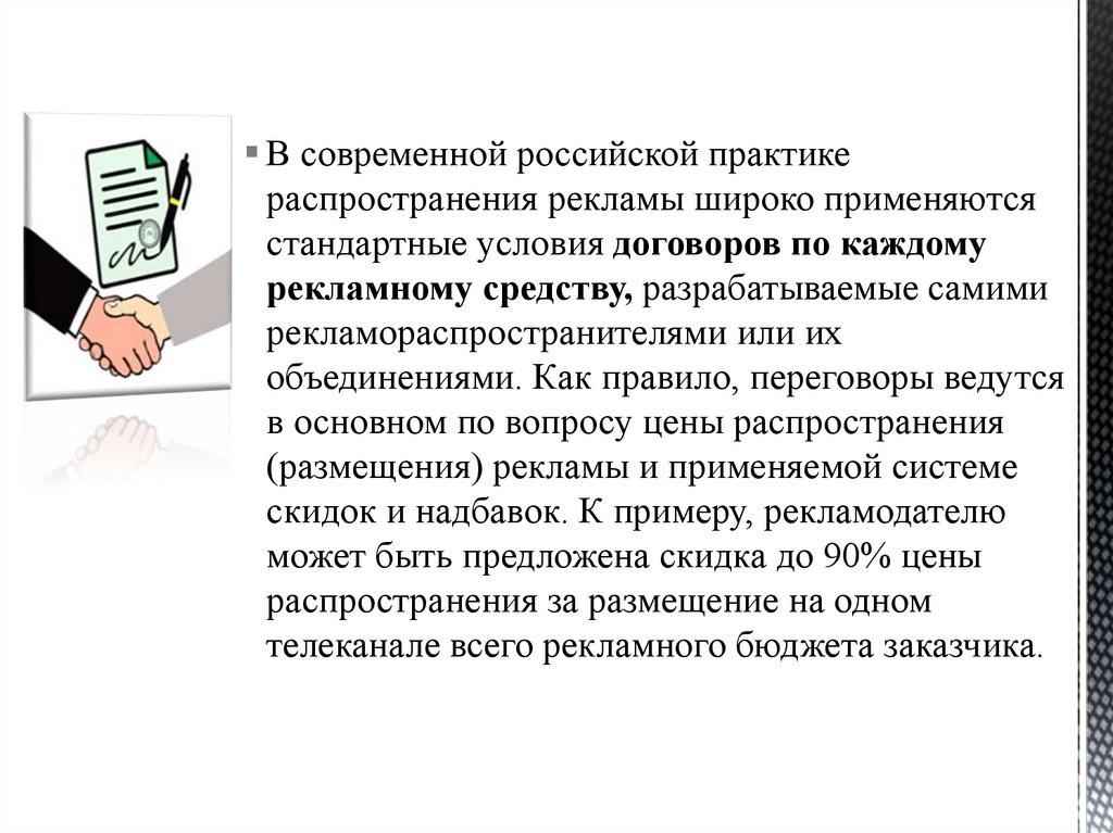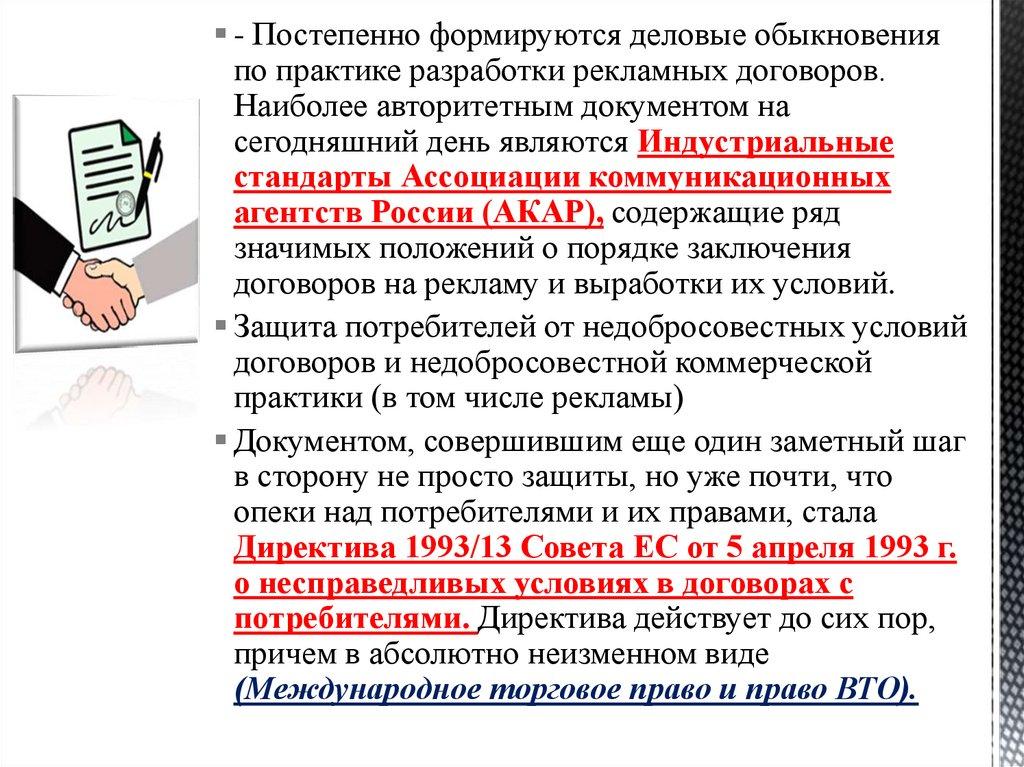 - Постепенно формируются деловые обыкновенияпо практике разработки рекламных договоров.
