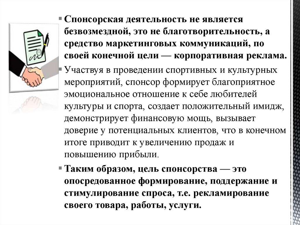 Спонсорская деятельность не являетсябезвозмездной, это не благотворительность, а