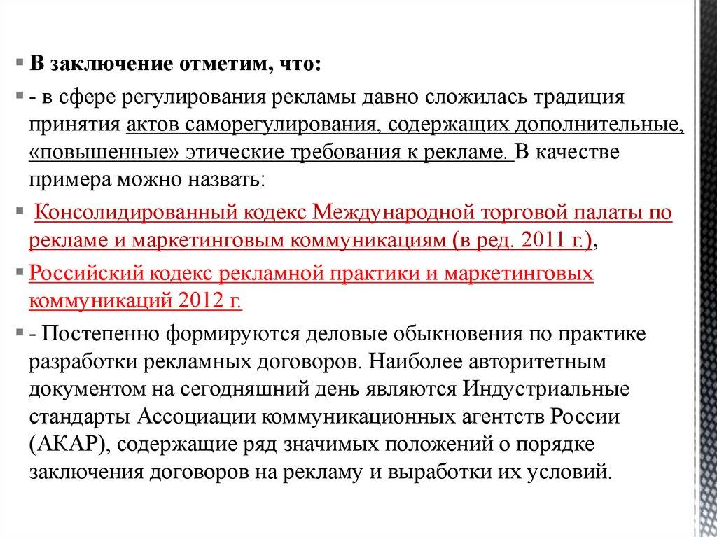 В заключение отметим, что:- в сфере регулирования рекламы давно сложилась традиция