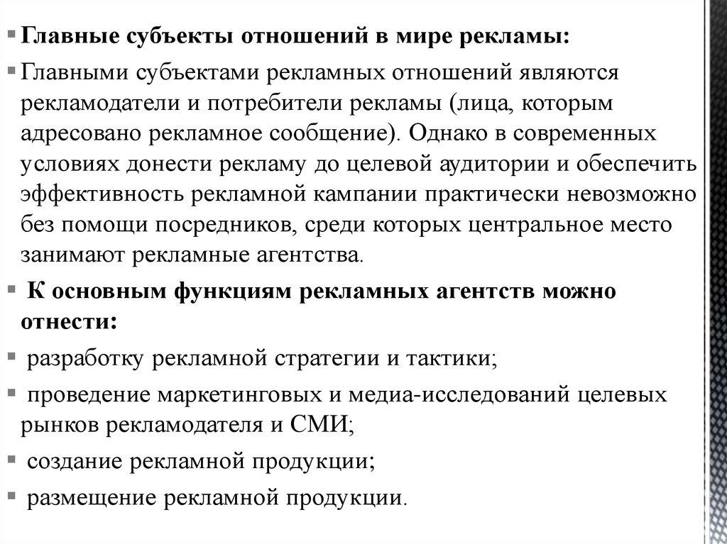 Главные субъекты отношений в мире рекламы:Главными субъектами рекламных отношений являются