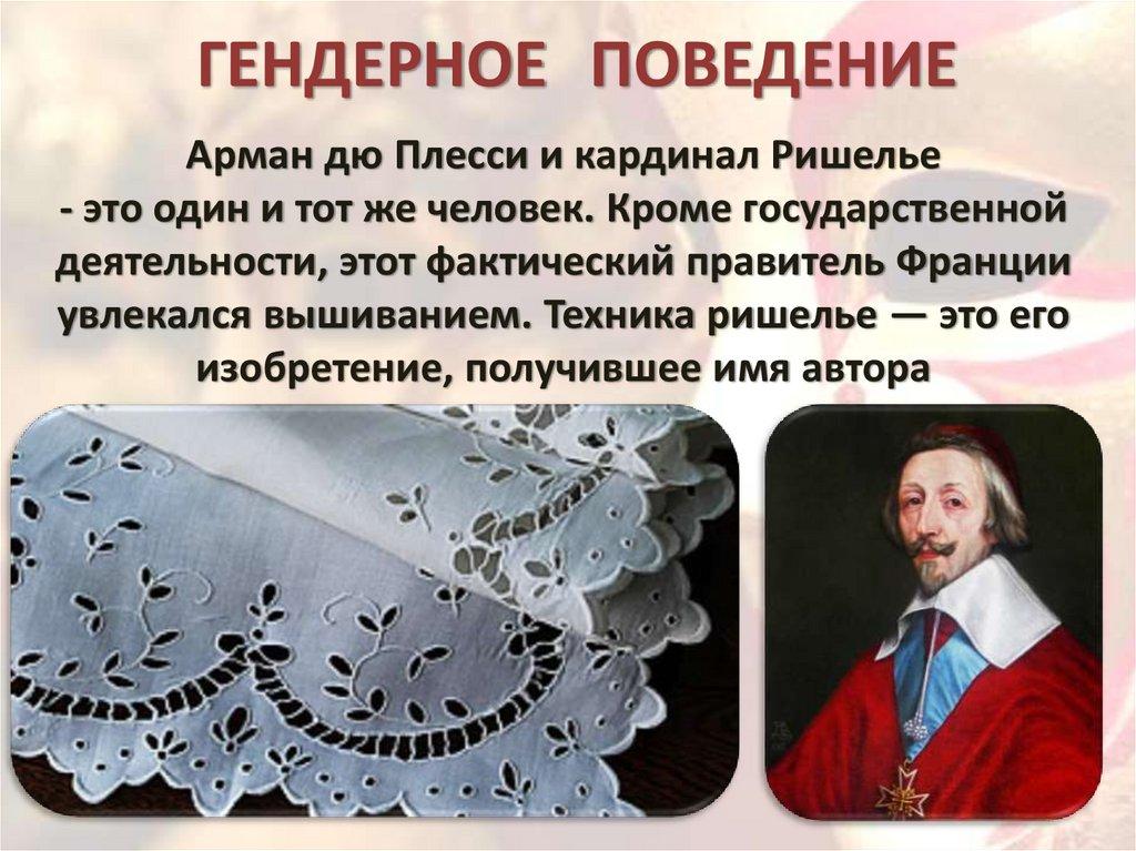 ГЕНДЕРНОЕ ПОВЕДЕНИЕВышивка в стиле РИШЕЛЬЕ —получила название: