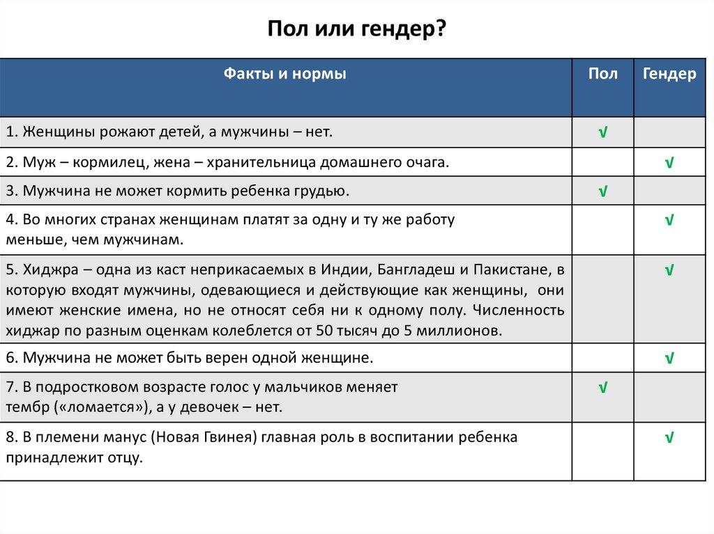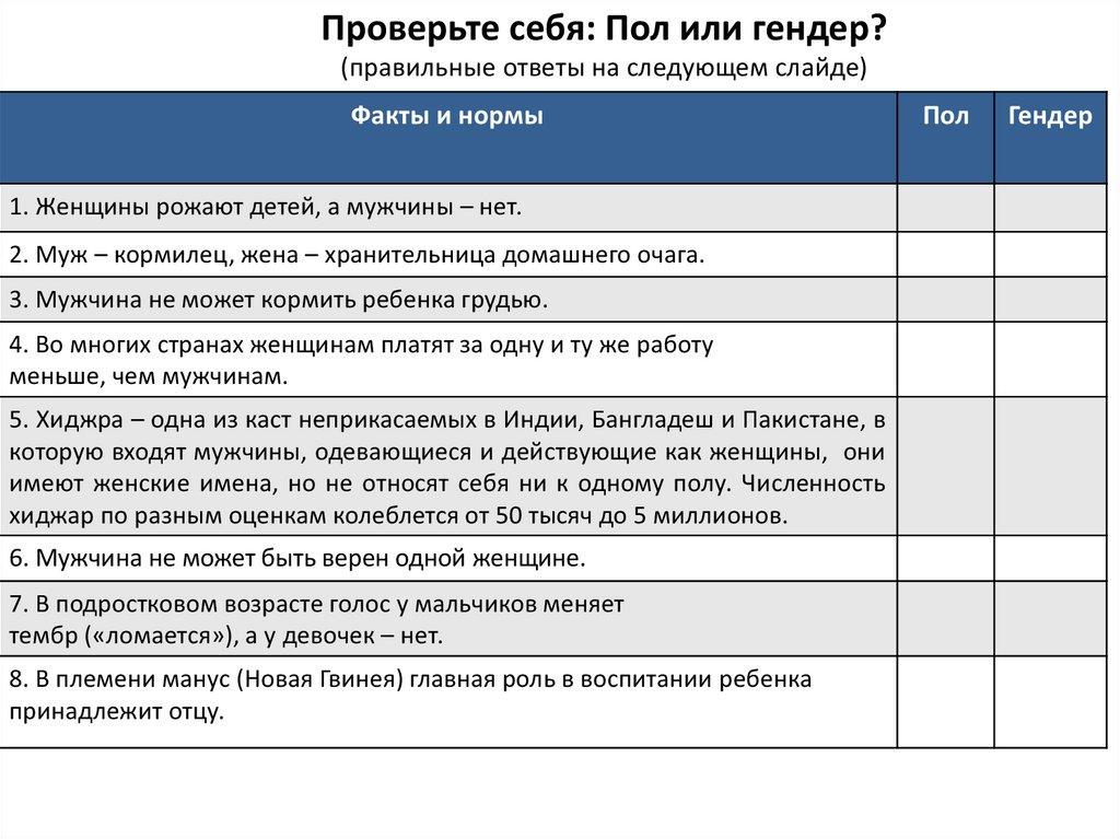 Проверьте себя: Пол или гендер?(правильные ответы на следующем слайде)