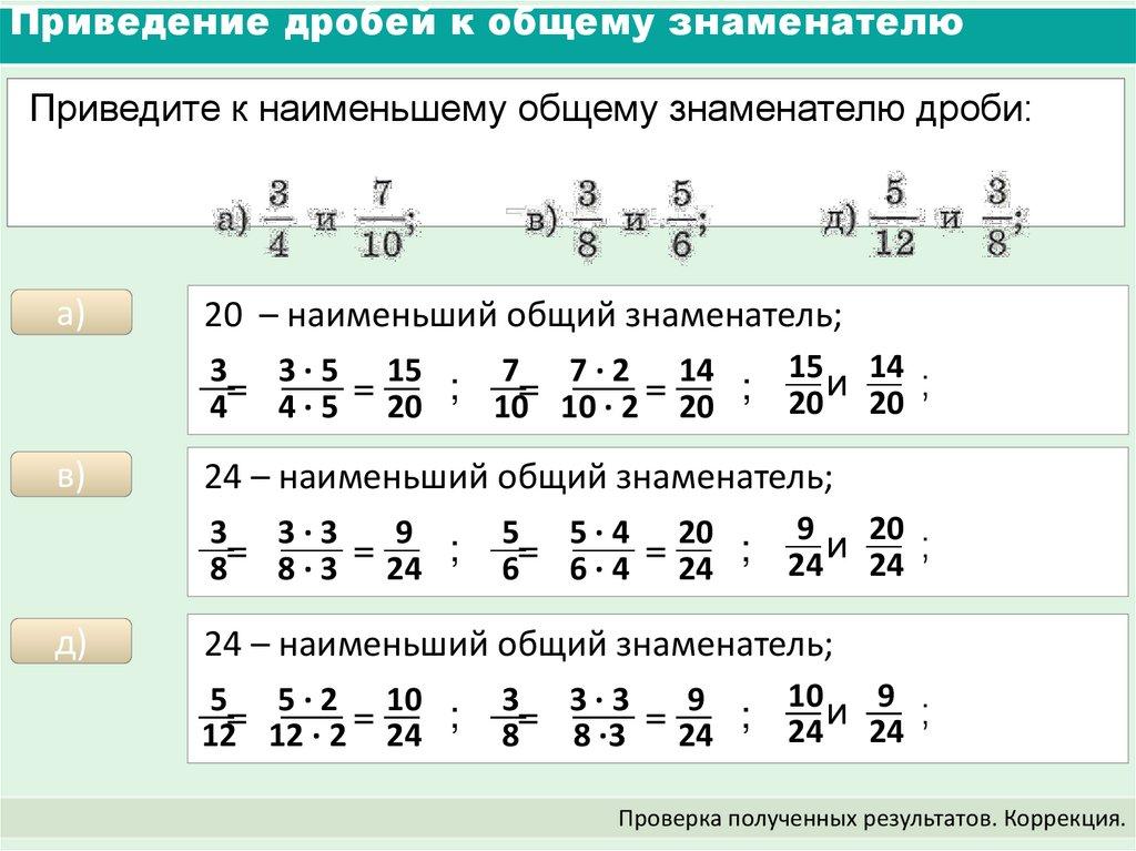 Приведение дробей к общему знаменателюПриведите к наименьшему общему знаменателю дроби: