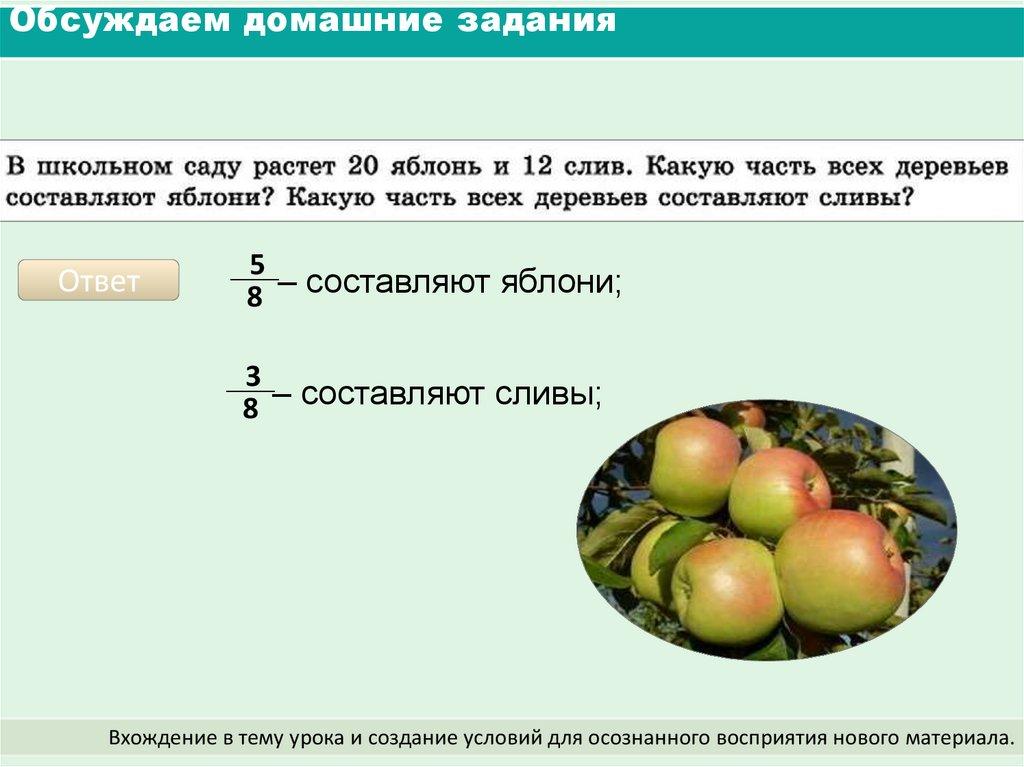 На столе 5 апельсинов, 7 яблок и 6 груш. Какую часть всех