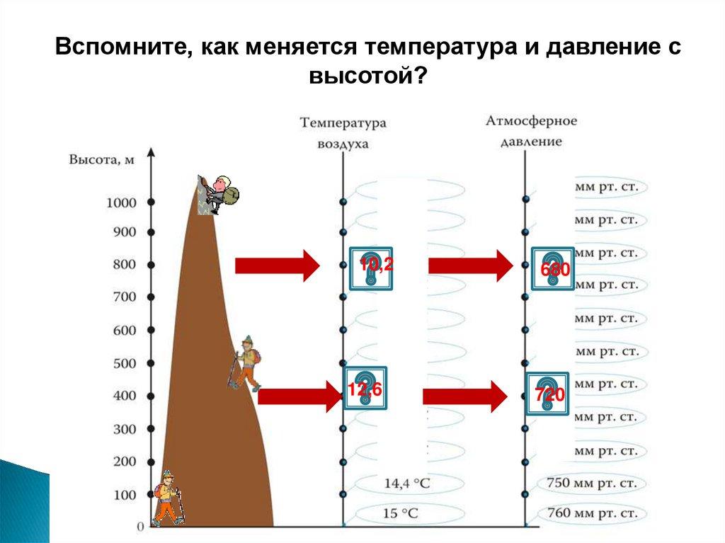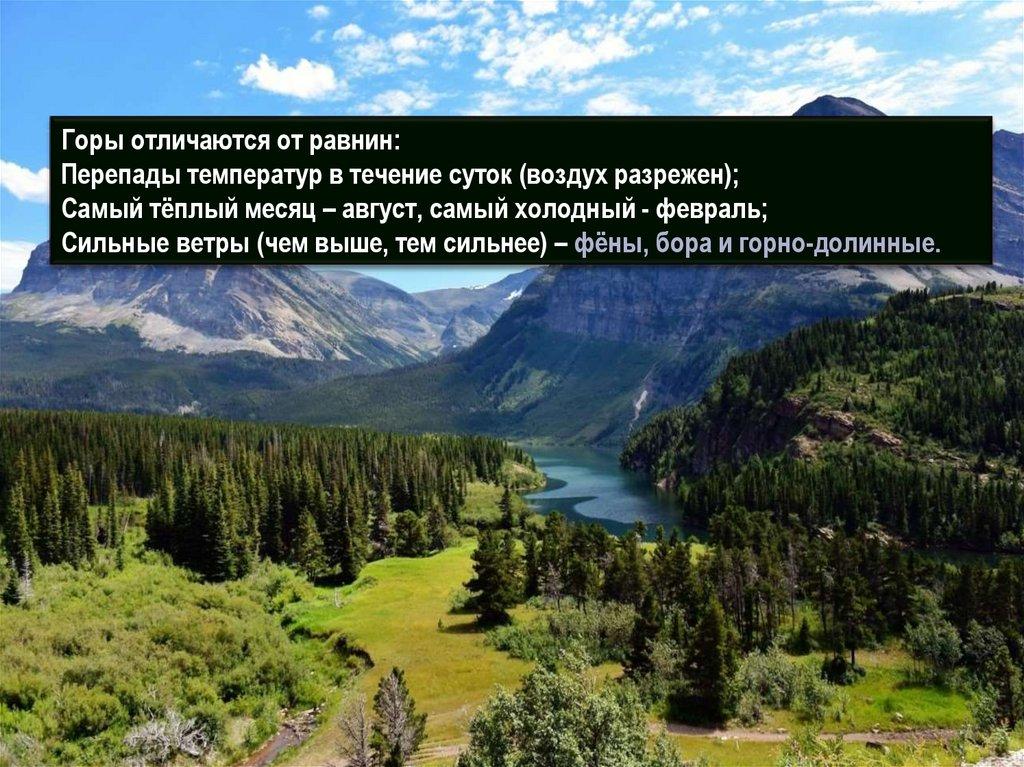 Горы отличаются от равнин:Перепады температур в течение суток (воздух разрежен);