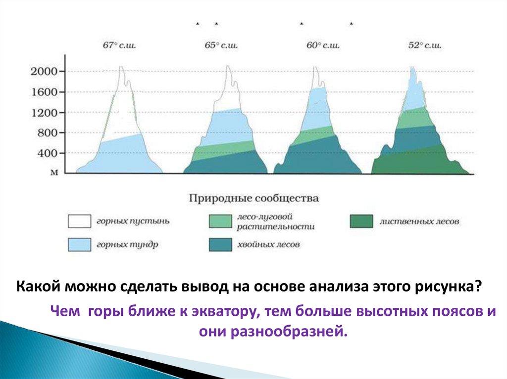 Какой можно сделать вывод на основе анализа этого рисунка?Чем горы ближе к экватору, тем больше высотных поясов и