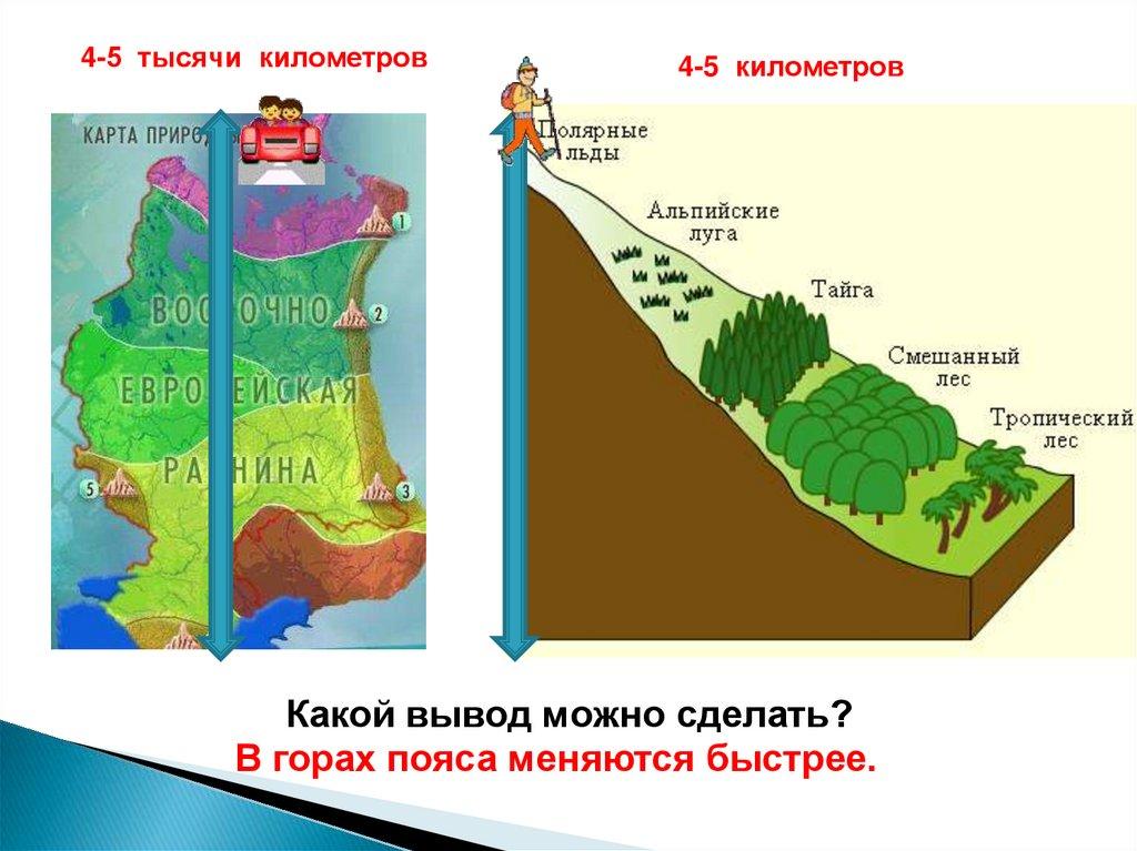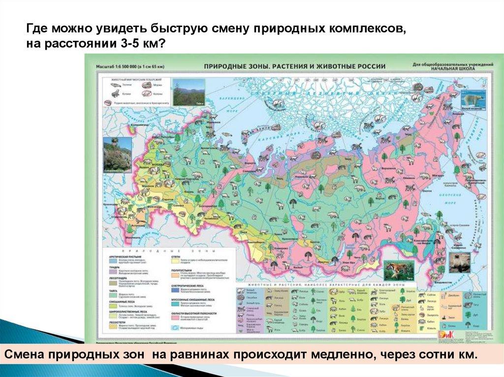 Смена природных зон на равнинах происходит медленно, через сотни км.