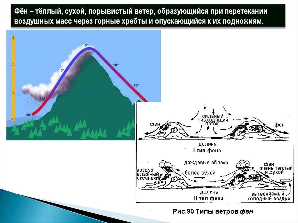 Фён – тёплый, сухой, порывистый ветер, образующийся при перетеканиивоздушных масс через горные хребты и опускающийся к их подножиям.