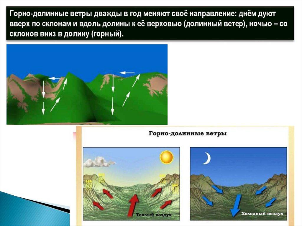 Горно-долинные ветры дважды в год меняют своё направление: днём дуютвверх по склонам и вдоль долины к её верховью (долинный ветер), ночью – со