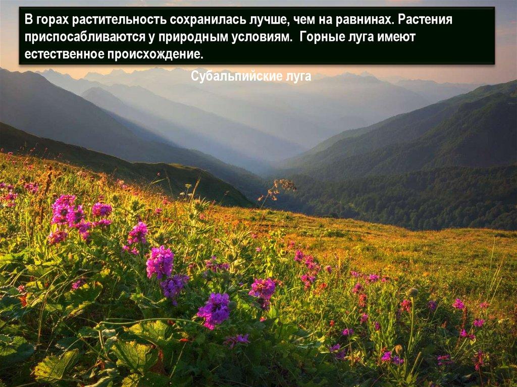 В горах растительность сохранилась лучше, чем на равнинах. Растенияприспосабливаются у природным условиям. Горные луга имеют