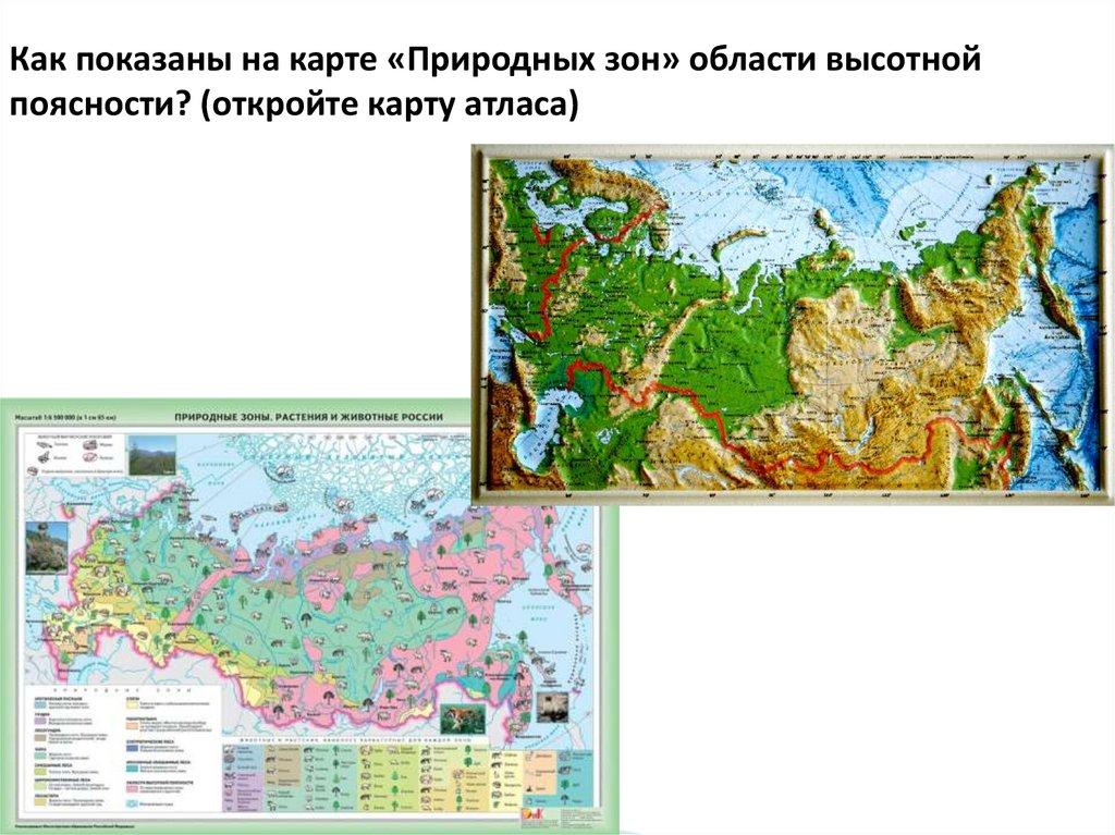 Как показаны на карте «Природных зон» области высотнойпоясности? (откройте карту атласа)