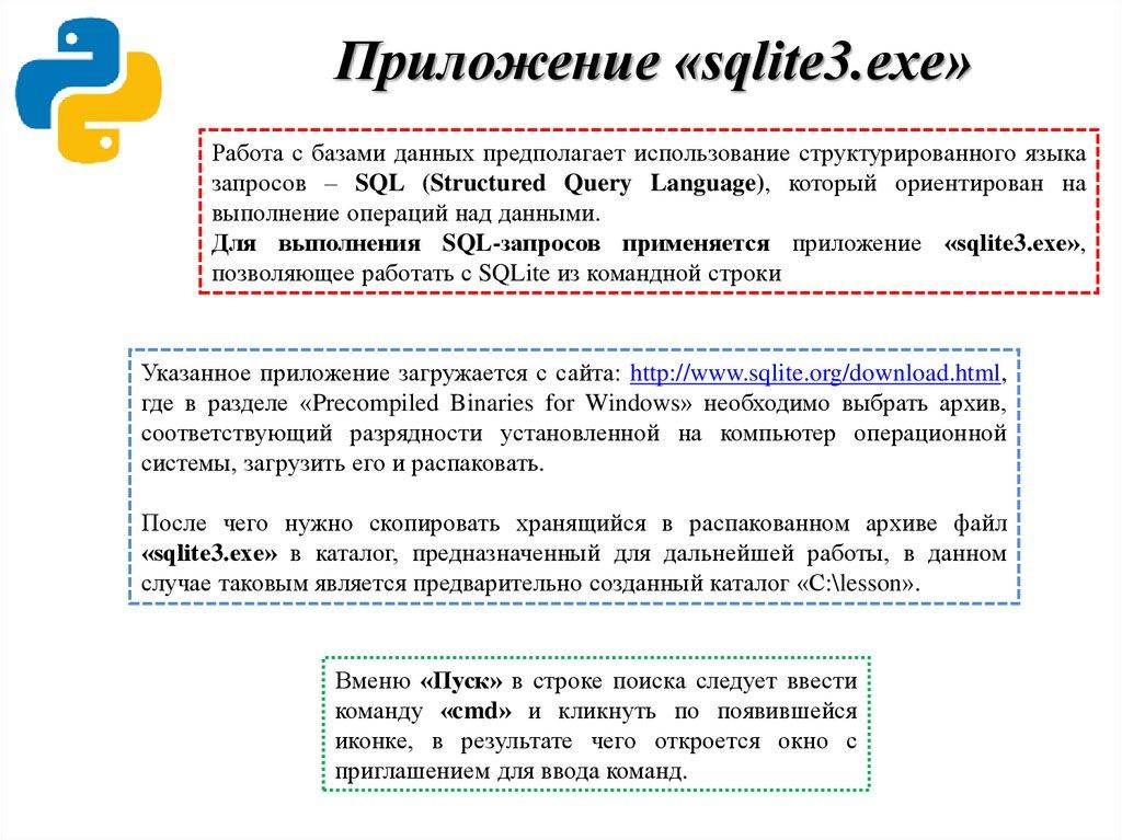 Приложение «sqlite3.exe»Работа с базами данных предполагает использование структурированного языка