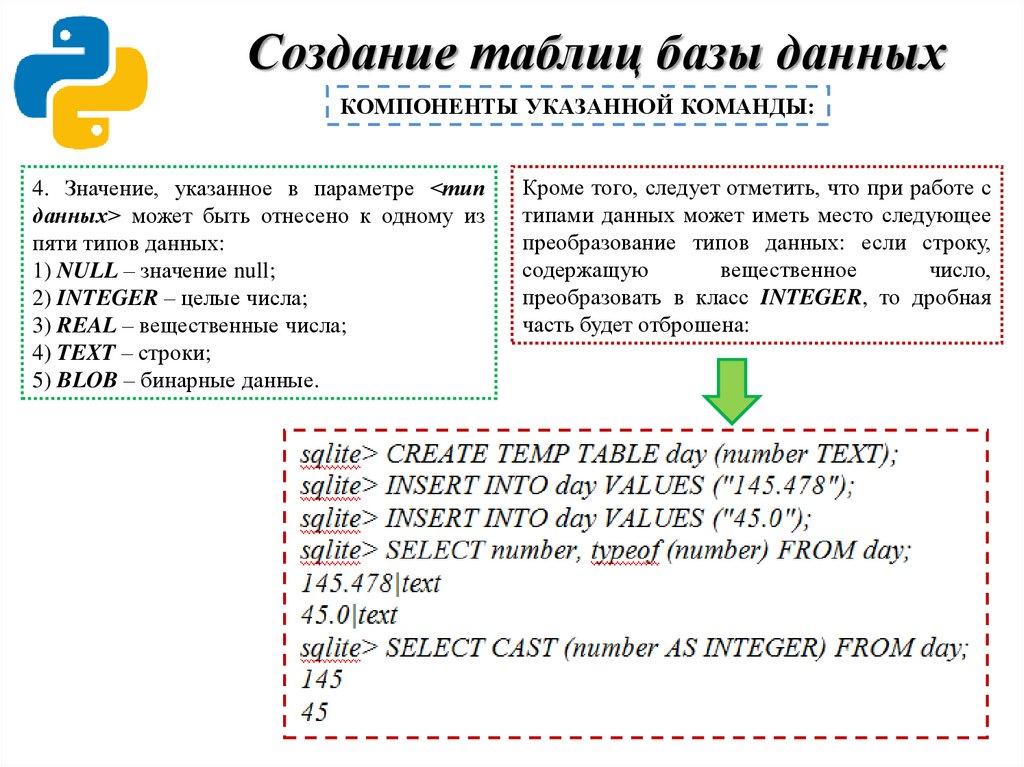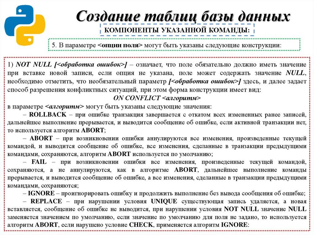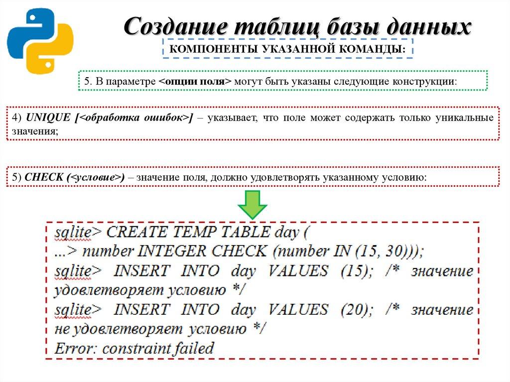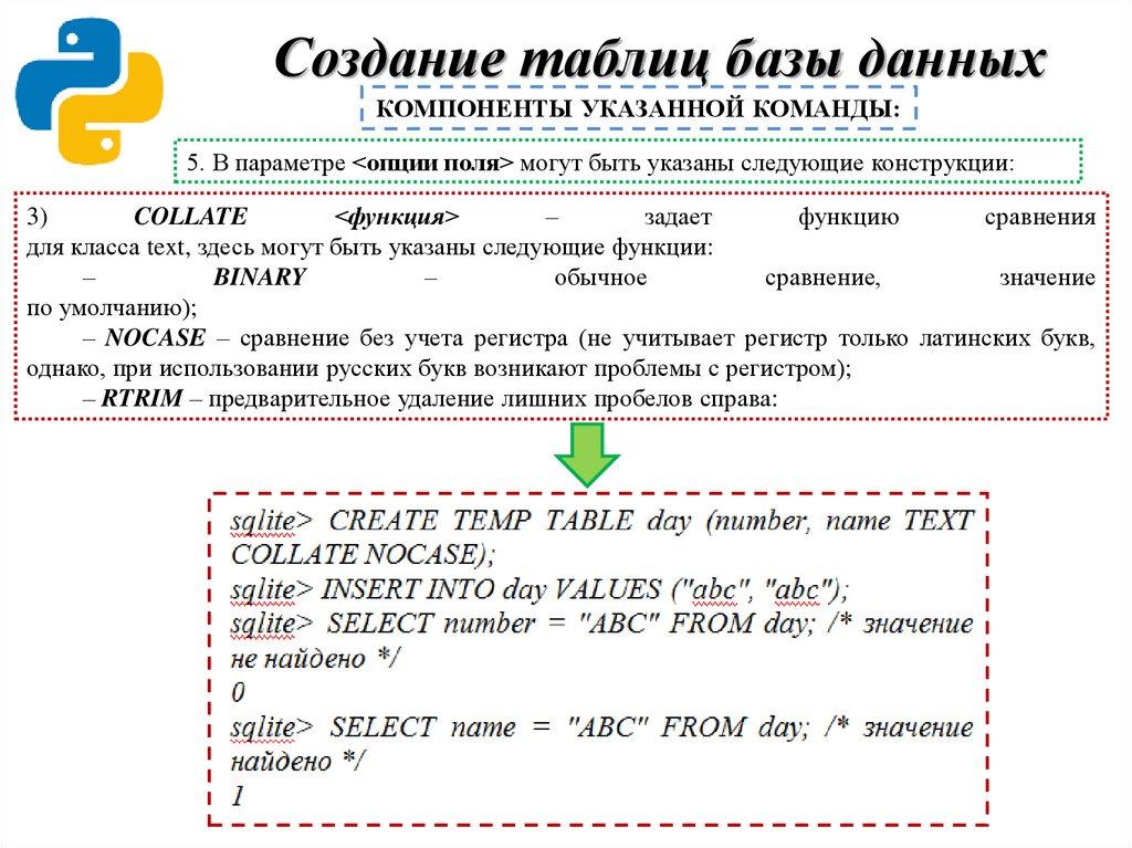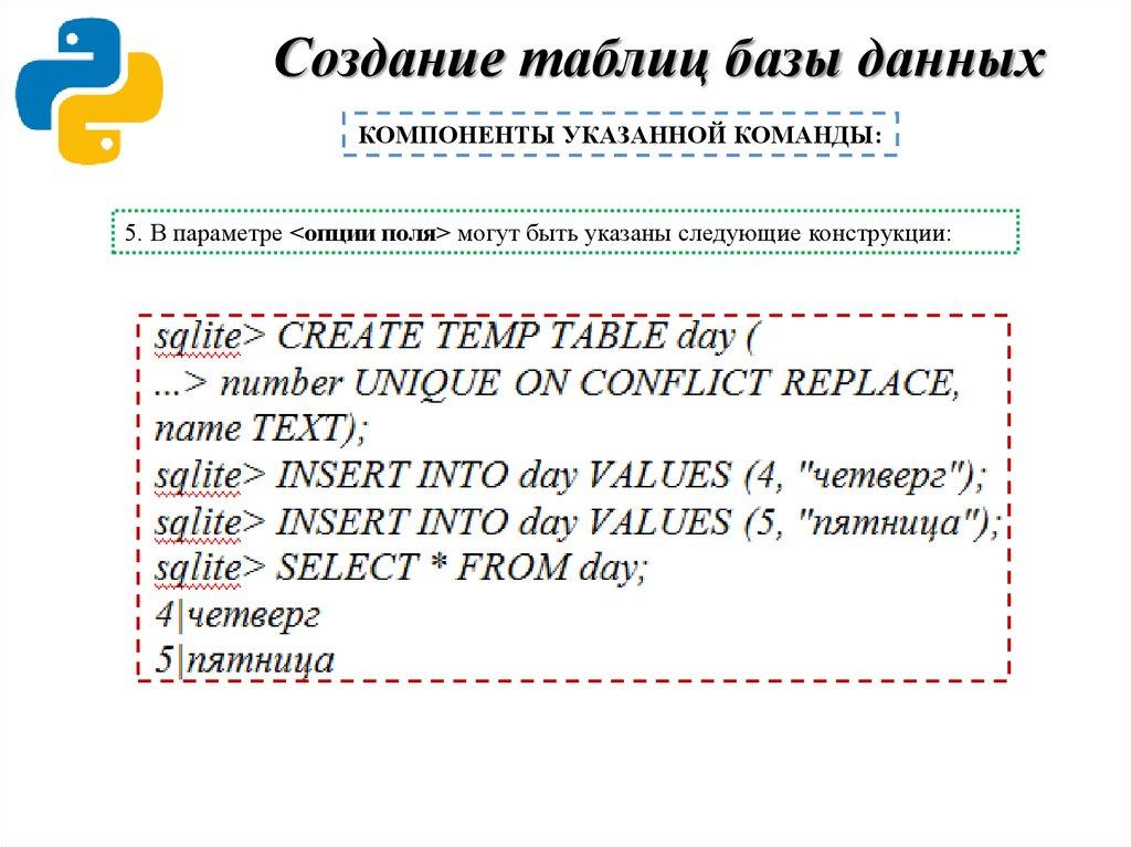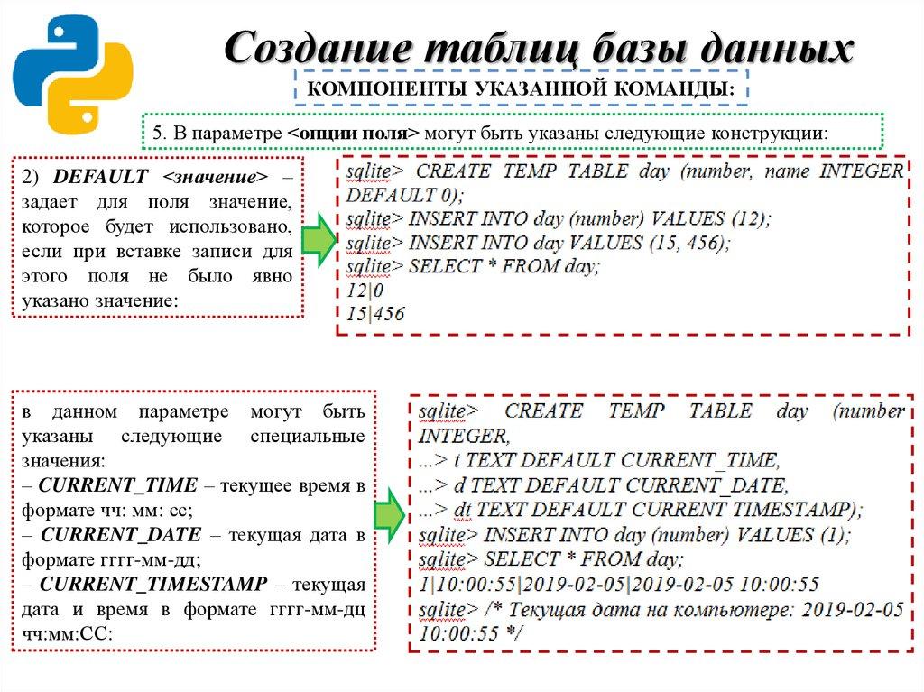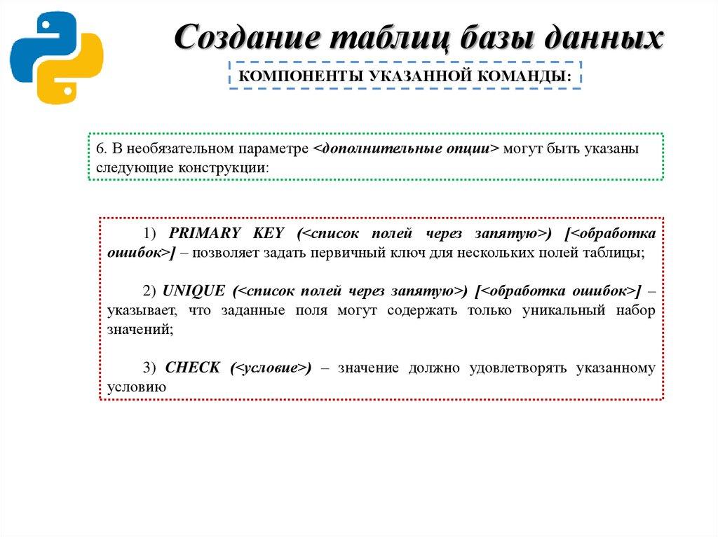Создание таблиц базы данныхКОМПОНЕНТЫ УКАЗАННОЙ КОМАНДЫ: