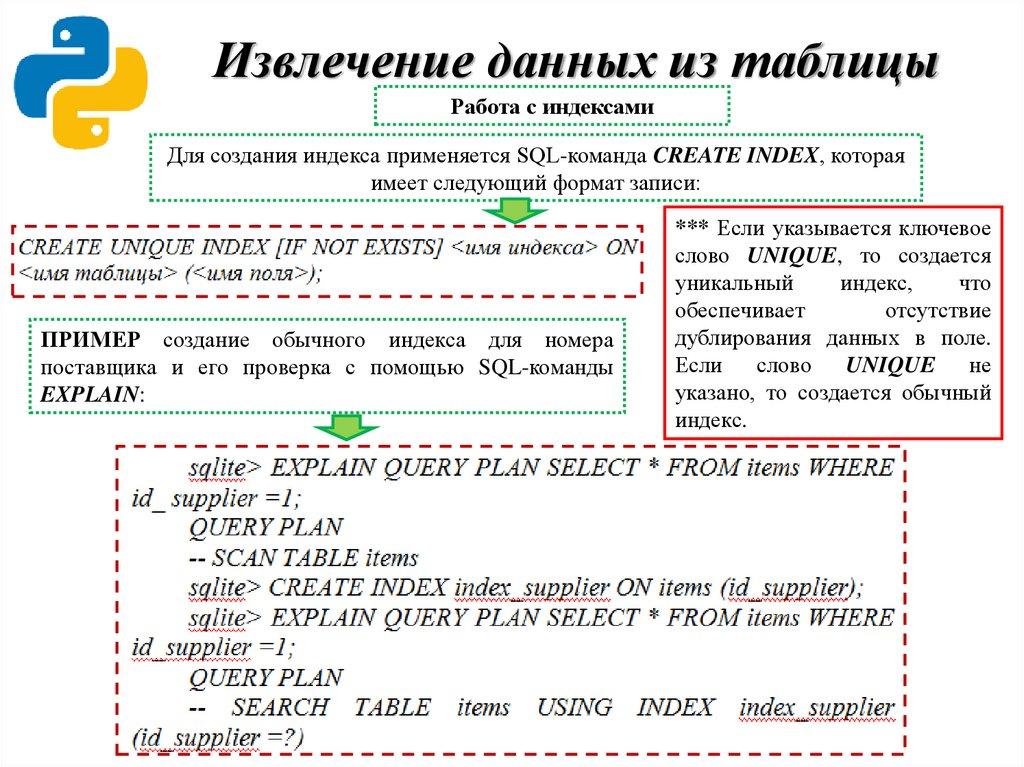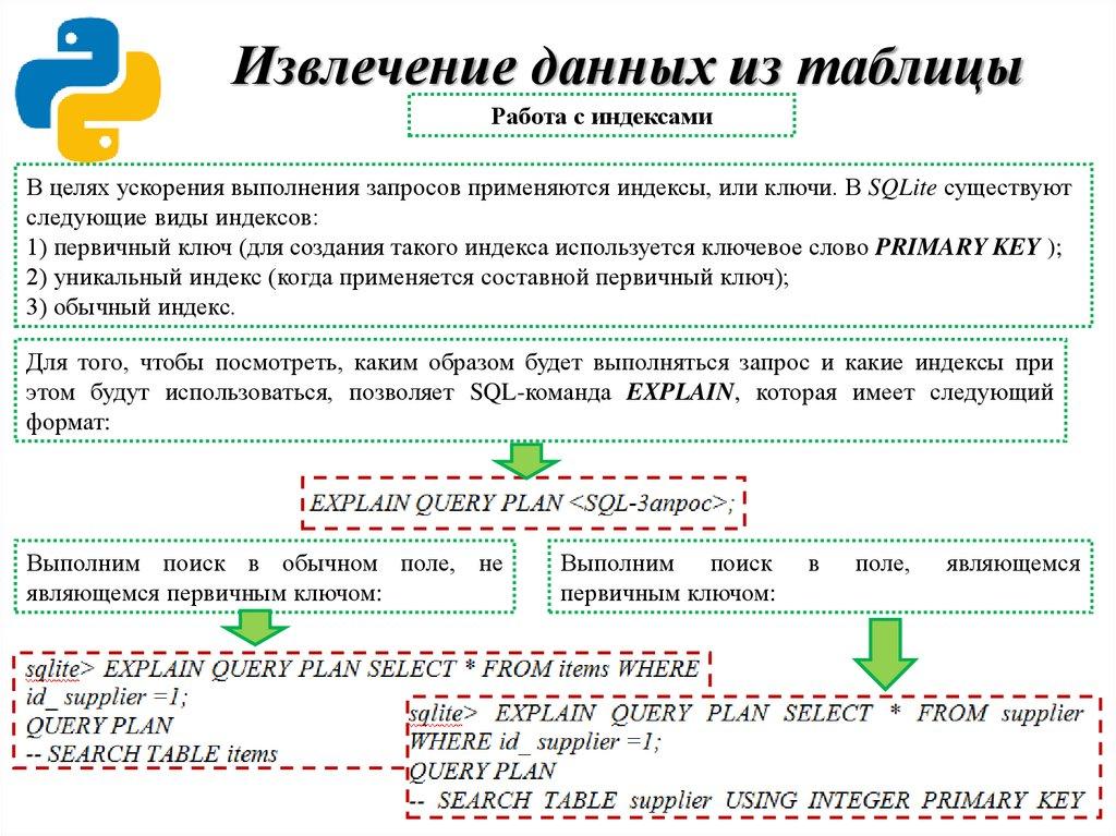 В целях ускорения выполнения запросов применяются индексы, или ключи. В SQLite существуют