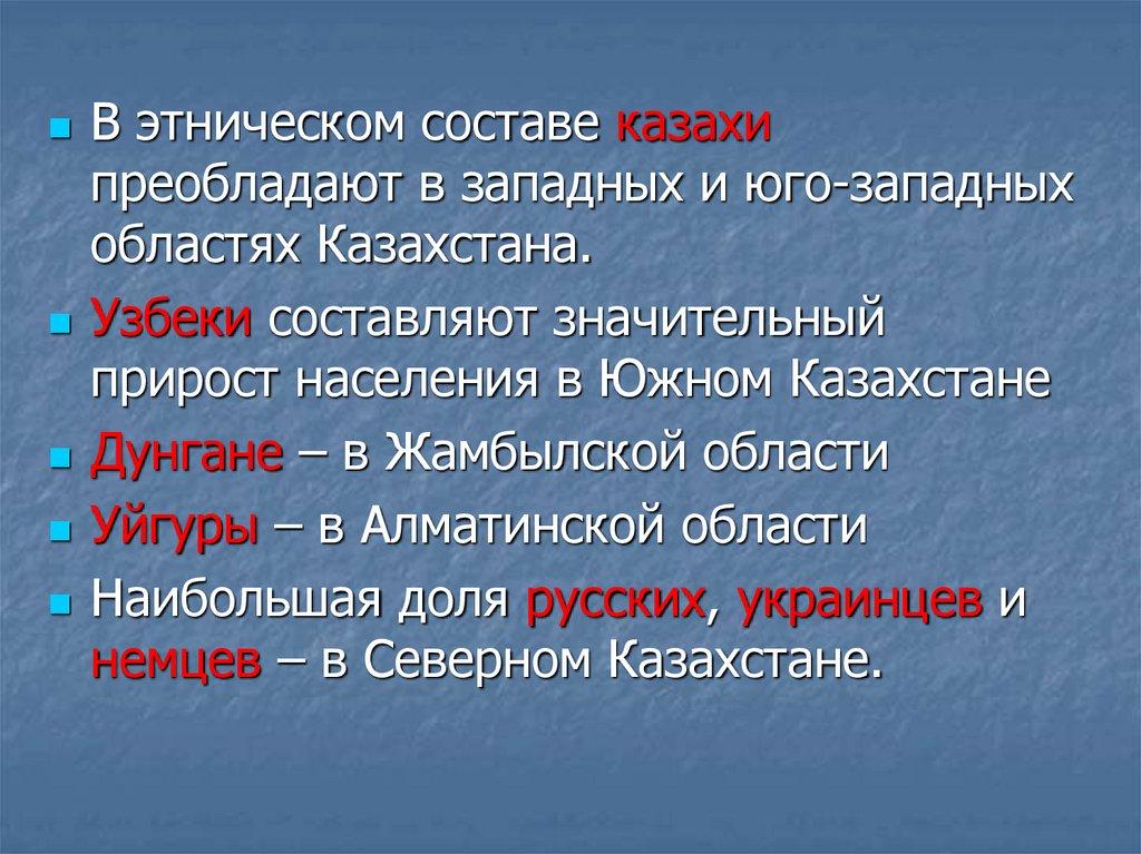 В этническом составе казахипреобладают в западных и юго-западных