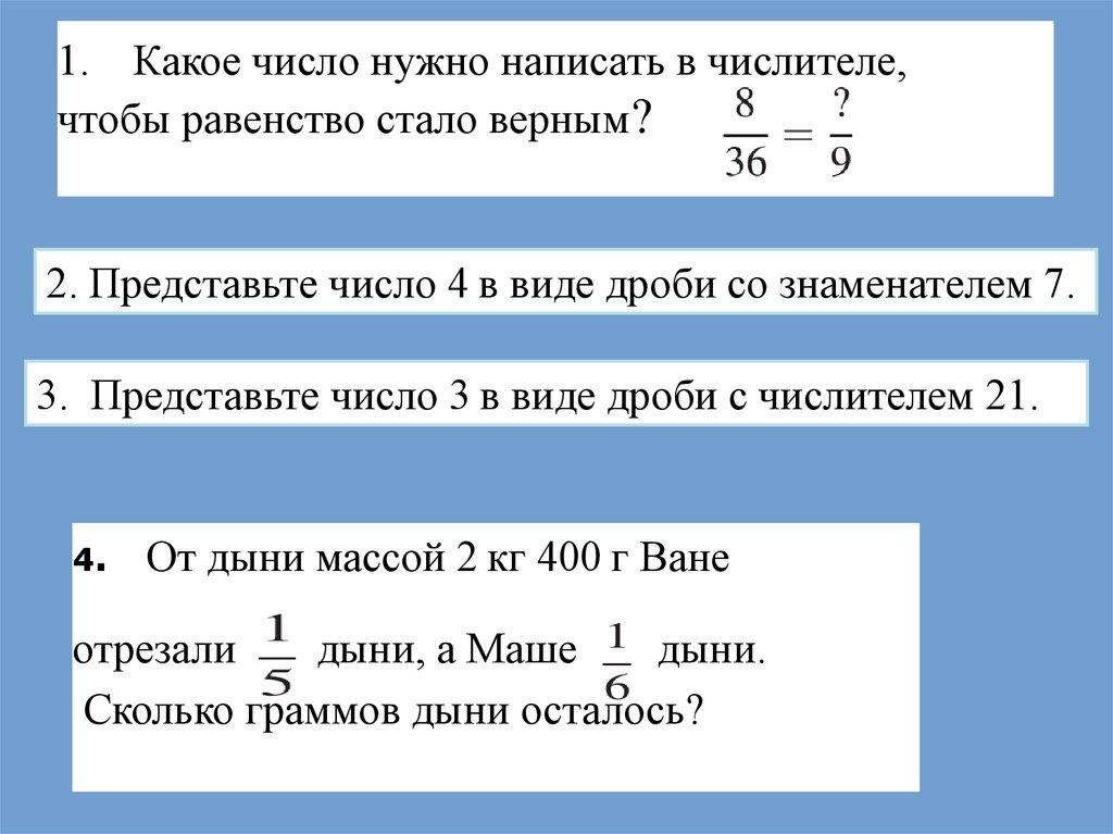 1. Какое число нужно написать в числителе,чтобы равенство стало верным?