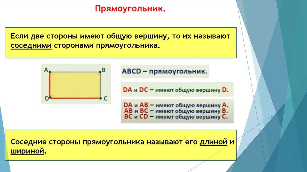 Прямоугольник.Если две стороны имеют общую вершину, то их называют