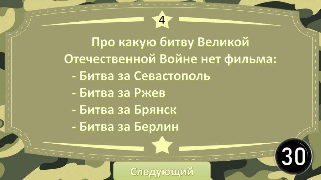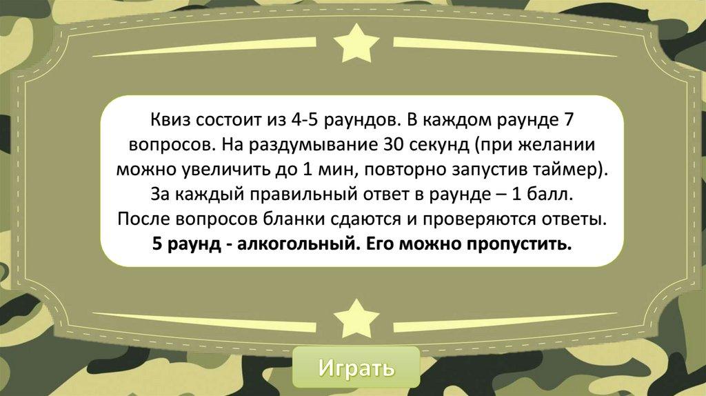 Квиз состоит из 4-5 раундов. В каждом раунде 7вопросов. На раздумывание 30 секунд (при желании