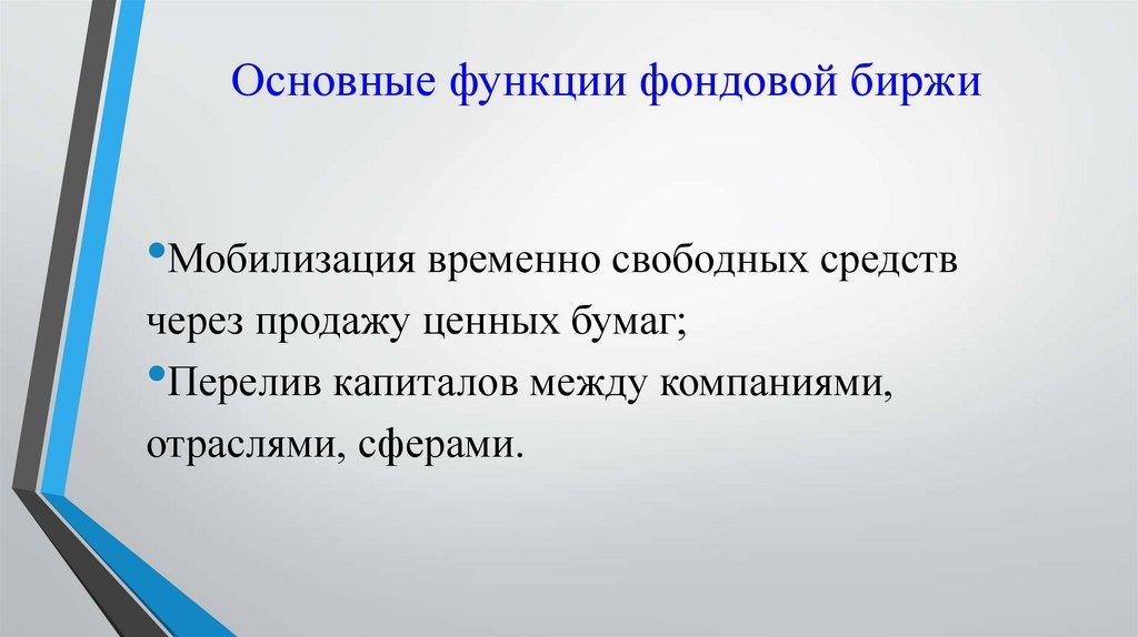 Основные функции фондовой биржи•Мобилизация временно свободных средств