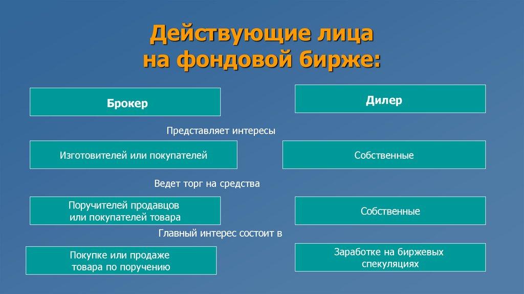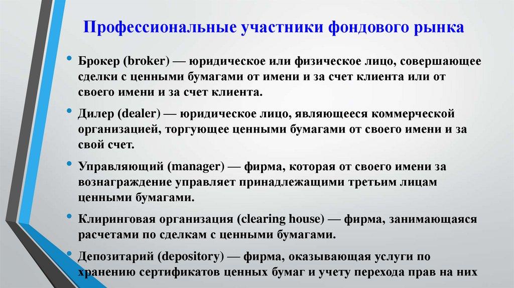 Профессиональные участники фондового рынка• Брокер (broker) — юридическое или физическое лицо, совершающее