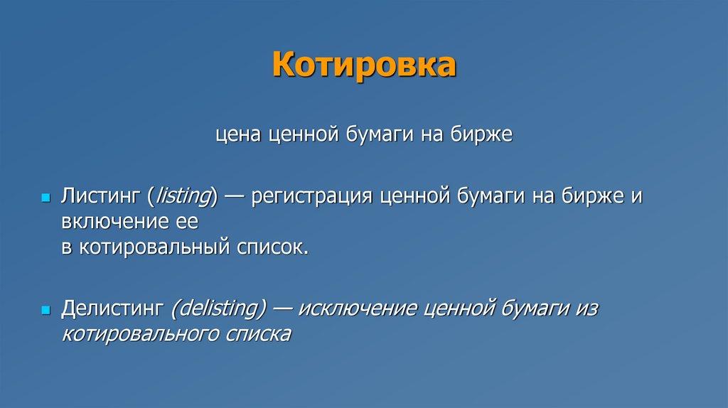 Листинг (listing) — регистрация ценной бумаги на бирже и