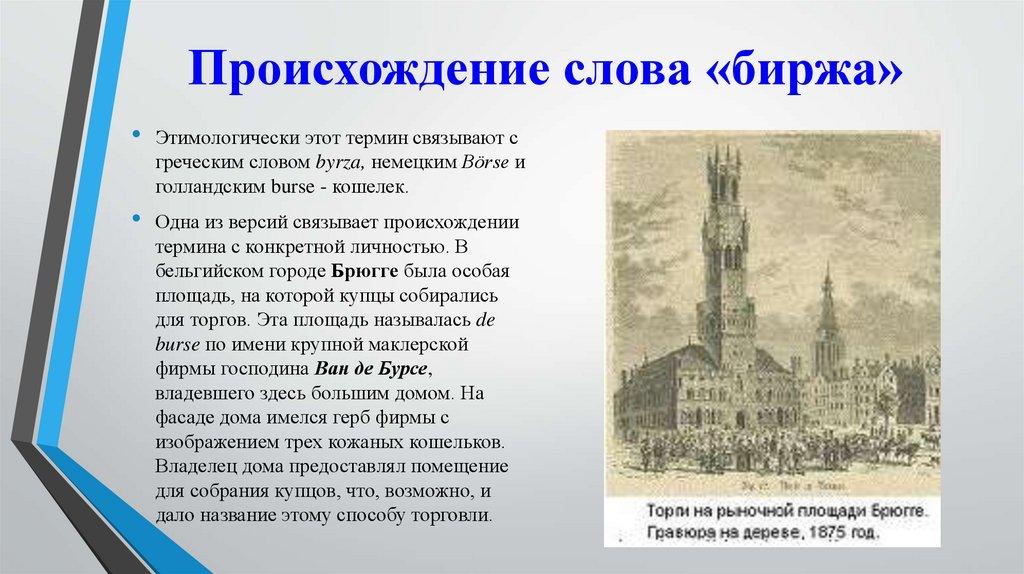 Происхождение слова «биржа»• Этимологически этот термин связывают с