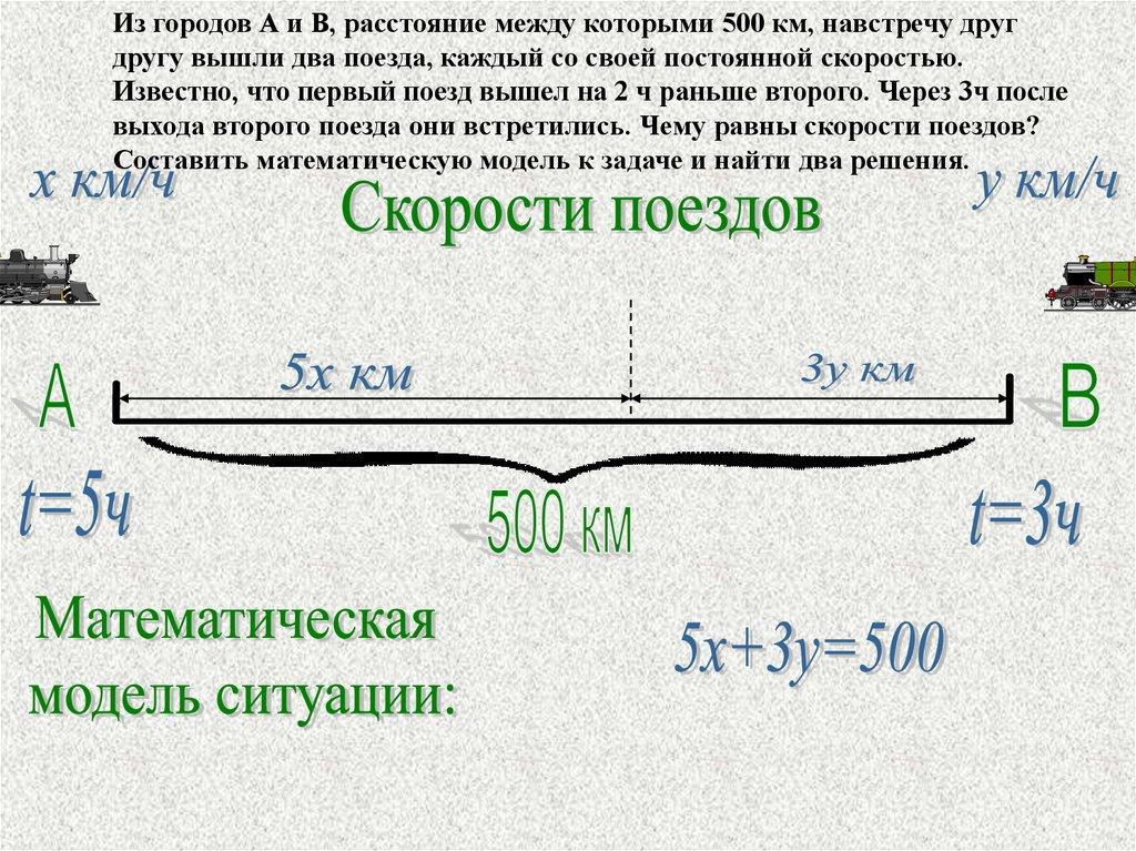 Из городов А и В, расстояние между которыми 500 км, навстречу другдругу вышли два поезда, каждый со своей постоянной скоростью.