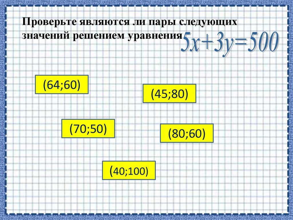 Решением уравненияназывают любую пару чисел (х;у), которая