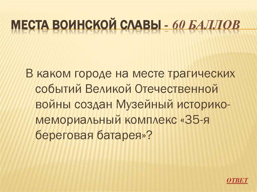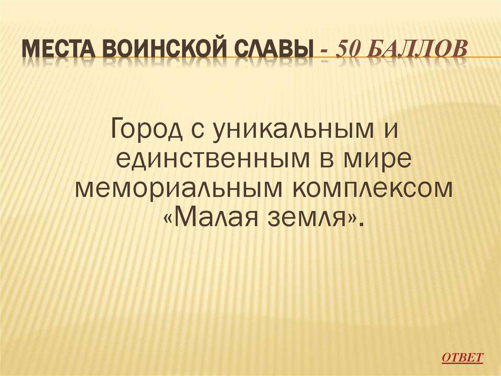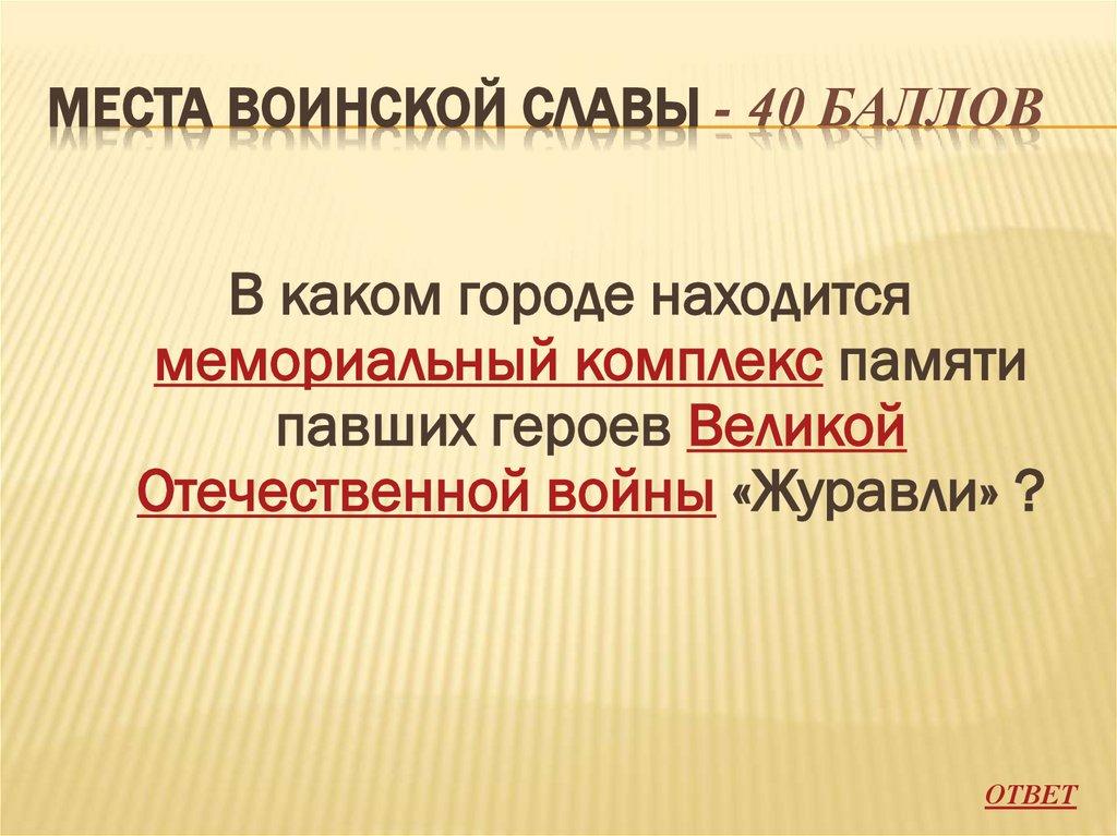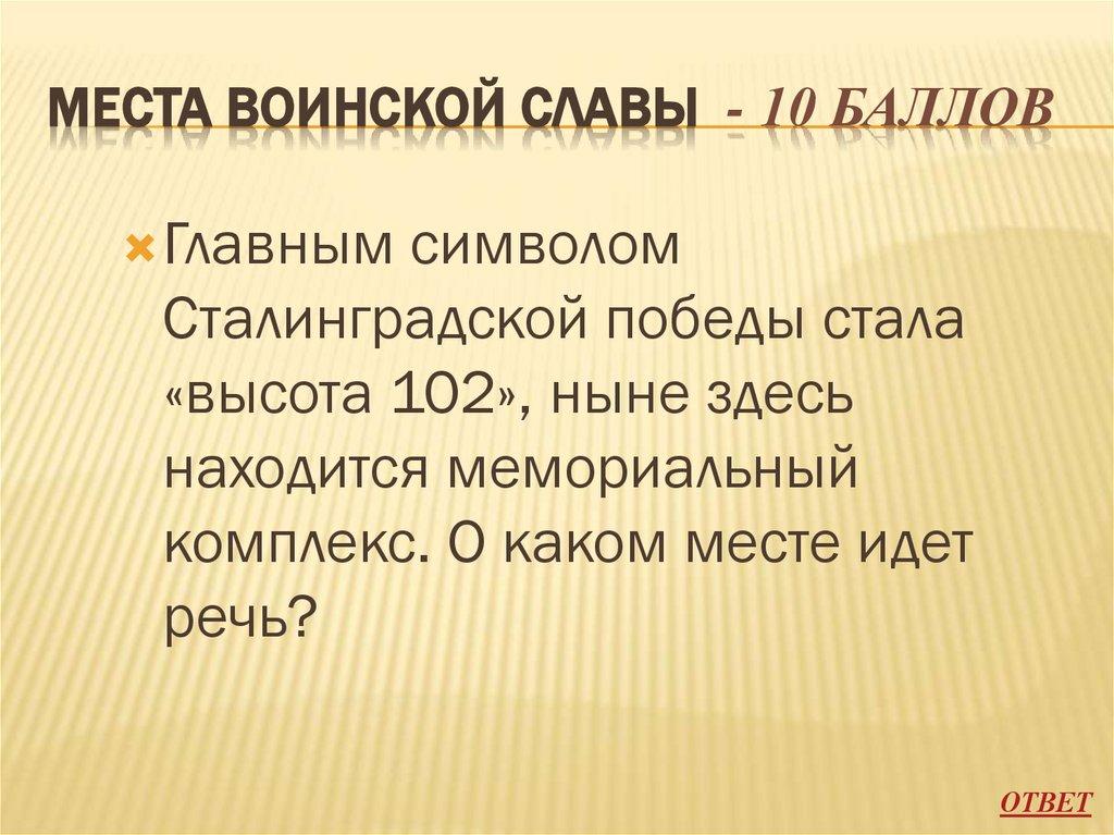 МЕСТА ВОИНСКОЙ СЛАВЫ - 10 БАЛЛОВГлавным символом