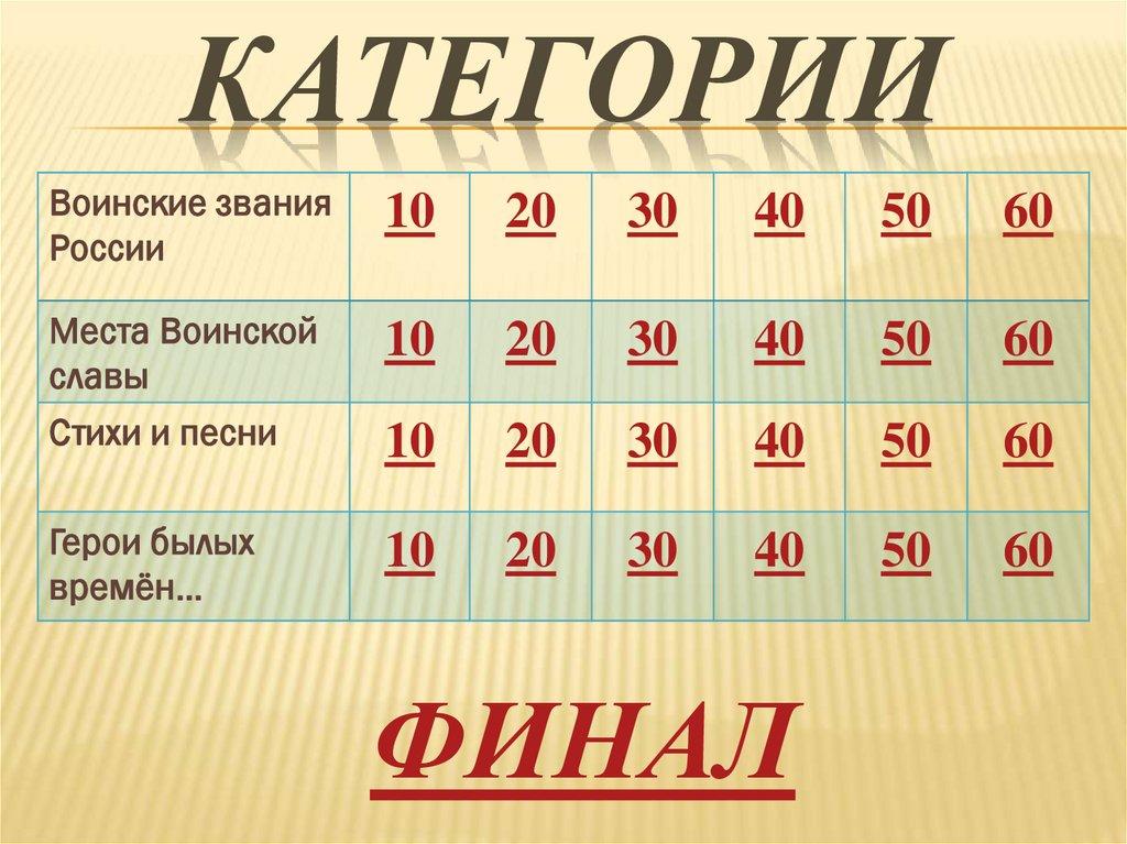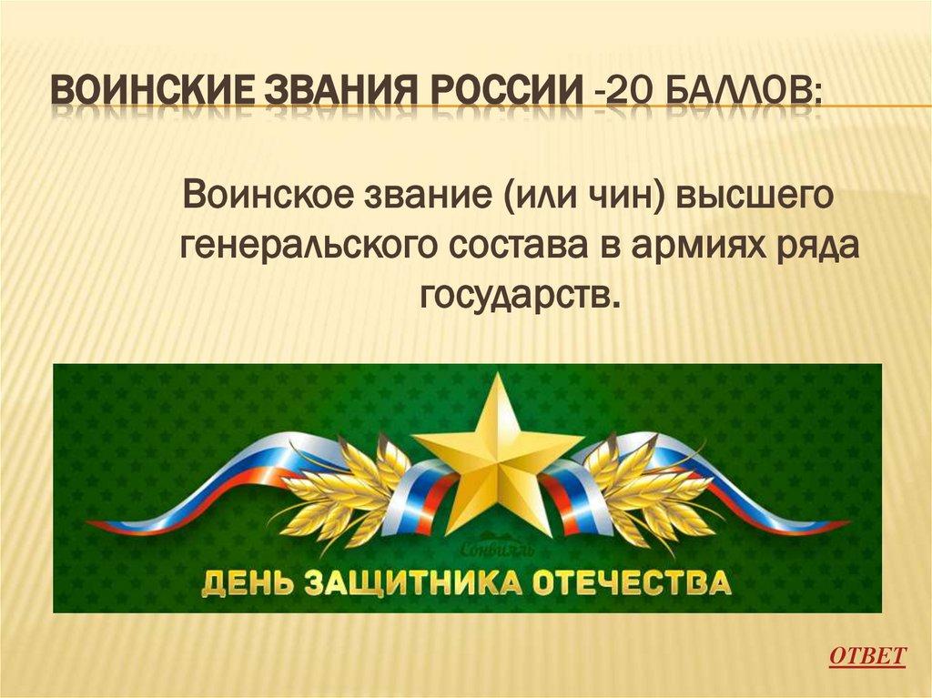 ВОИНСКИЕ ЗВАНИЯ РОССИИ -20 БАЛЛОВ:Воинское звание (или чин) высшего