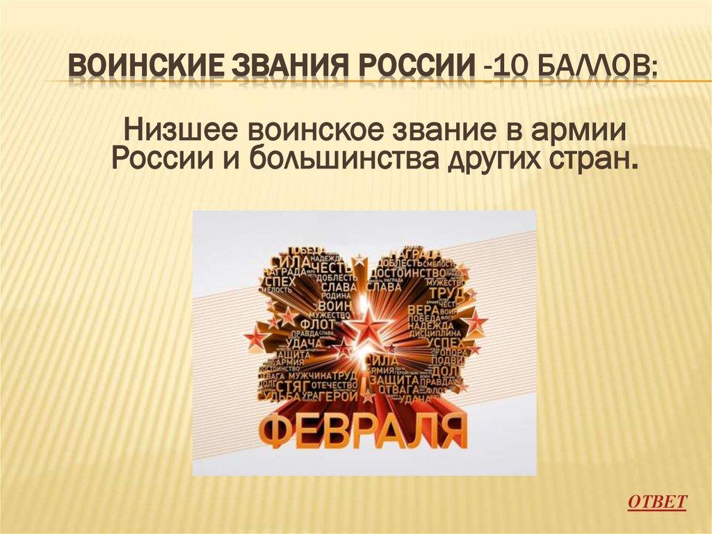 ВОИНСКИЕ ЗВАНИЯ РОССИИ -10 БАЛЛОВ:Низшее воинское звание в армии