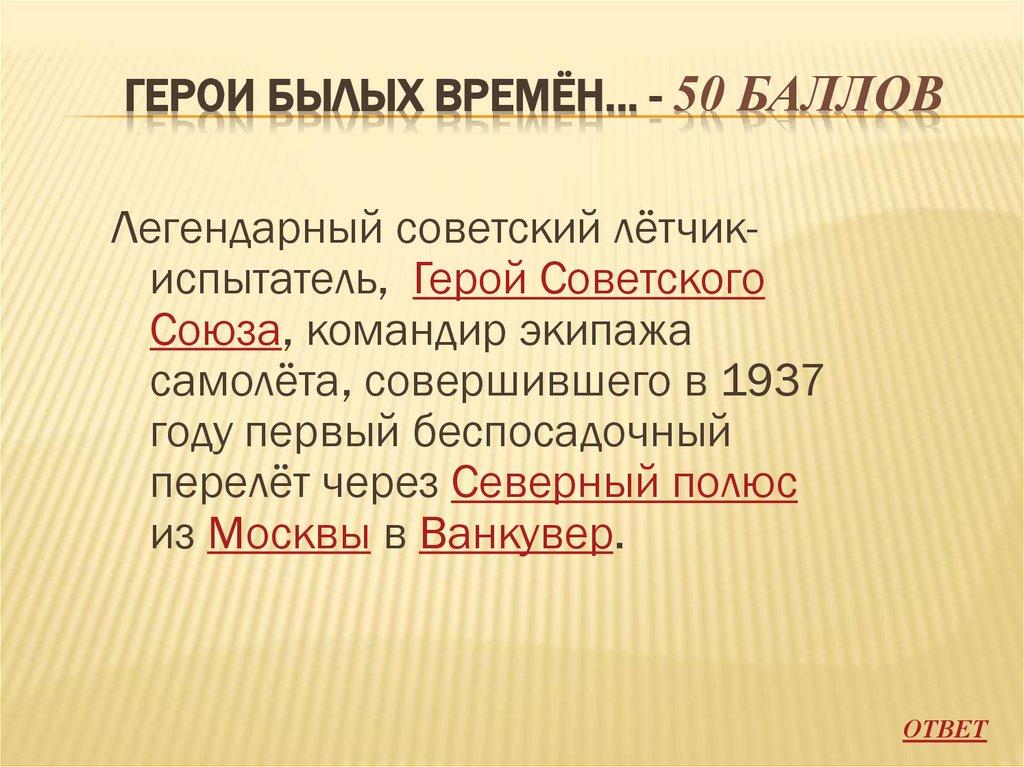 ГЕРОИ БЫЛЫХ ВРЕМЁН… - 50 БАЛЛОВЛегендарный советский лётчикиспытатель, Герой Советского