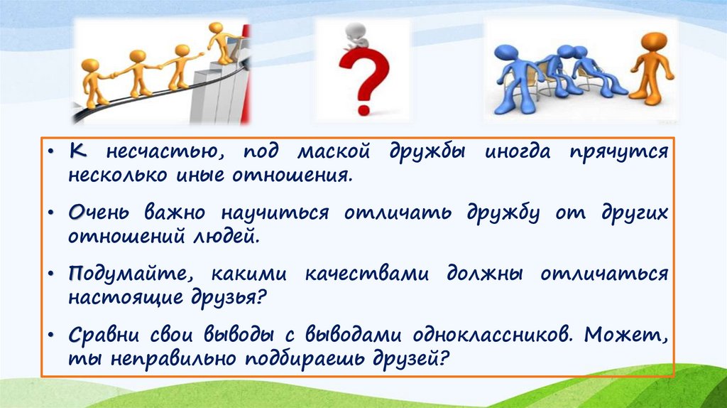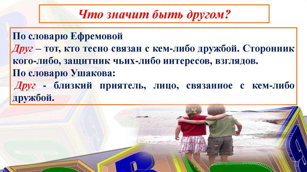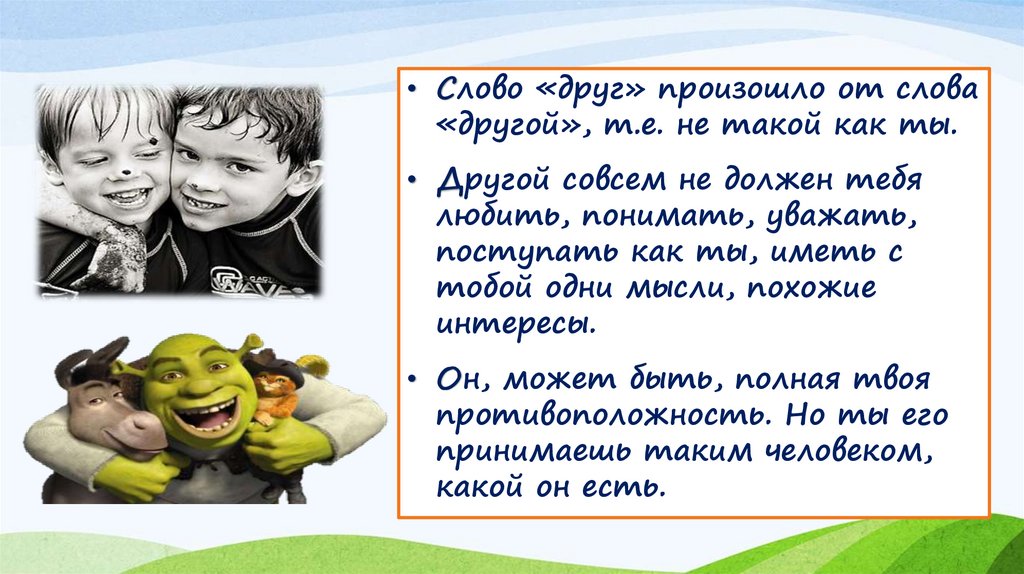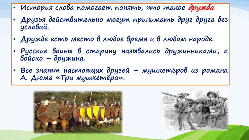 • История слова помогает понять, что такое дружба.• Друзья действительно могут принимать друг друга без