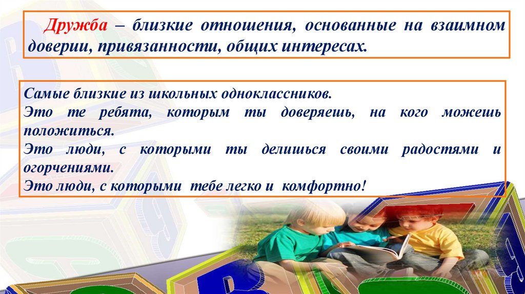 Дружба – близкие отношения, основанные на взаимномдоверии, привязанности, общих интересах.