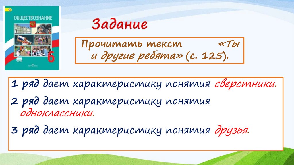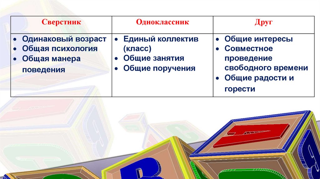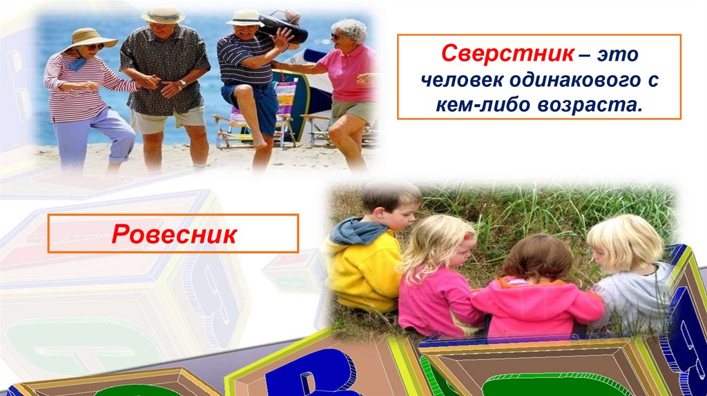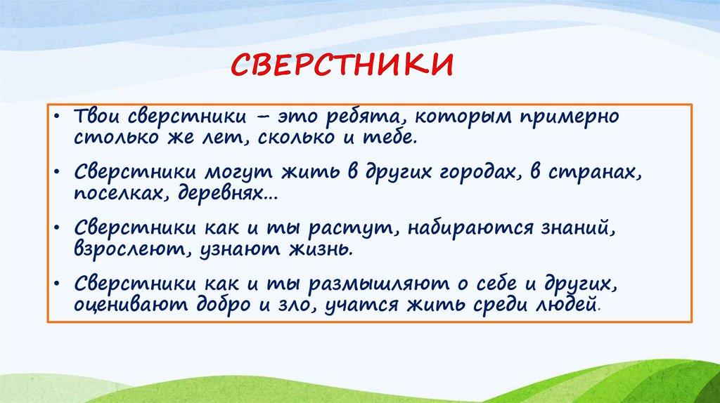 • Твои сверстники – это ребята, которым примерностолько же лет, сколько и тебе.